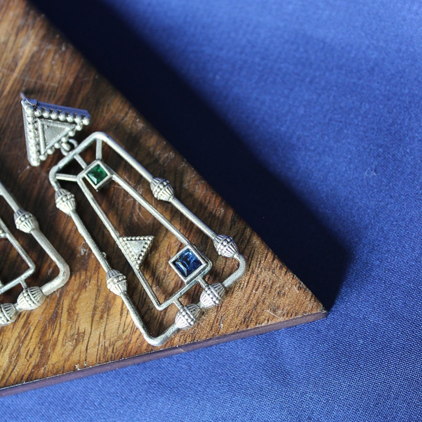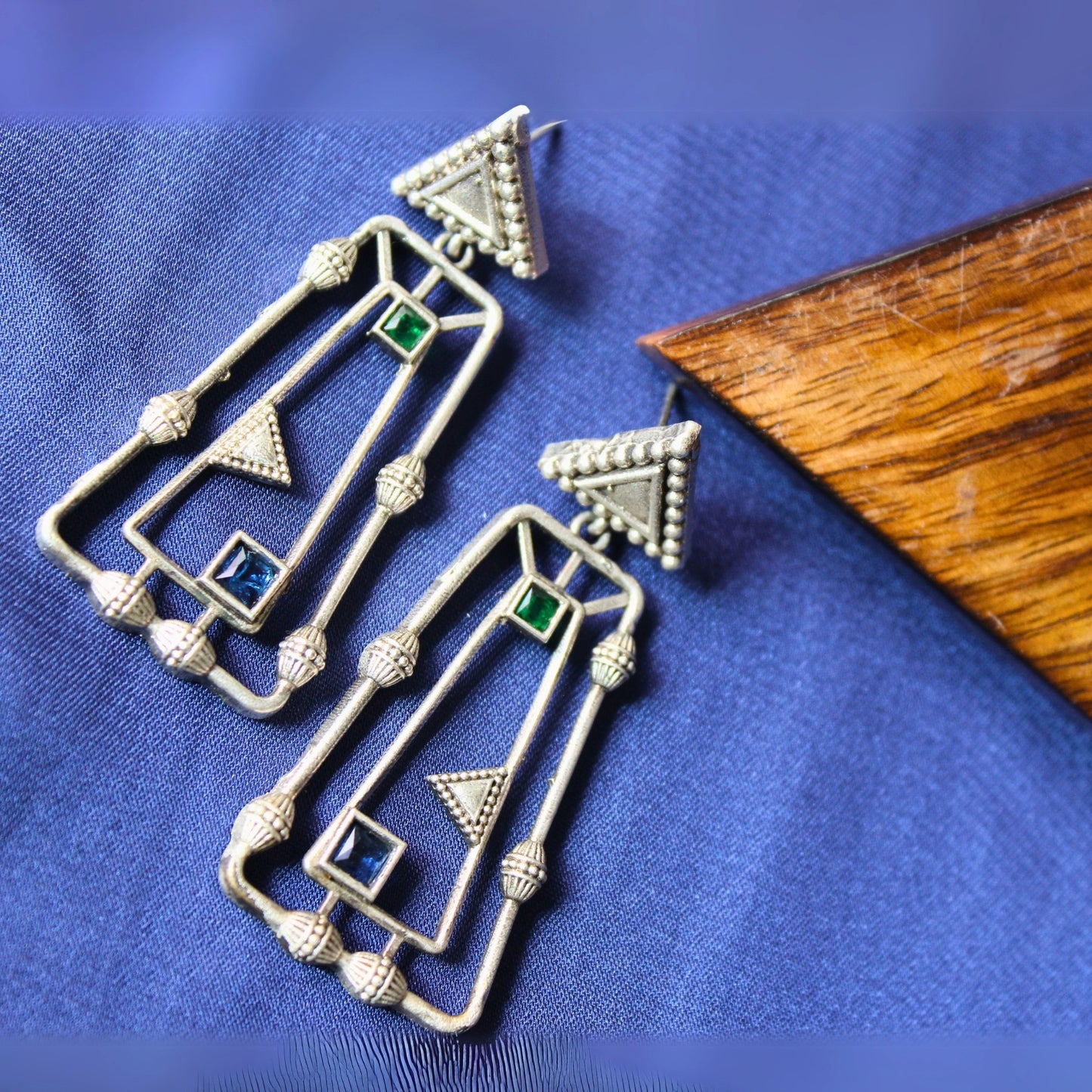Modern silver-toned earrings with an abstract, geometric design. Features cut-out shapes and small green and blue stone accents. These statement earrings offer a contemporary, artistic look. Pushback closure for secure wear.
