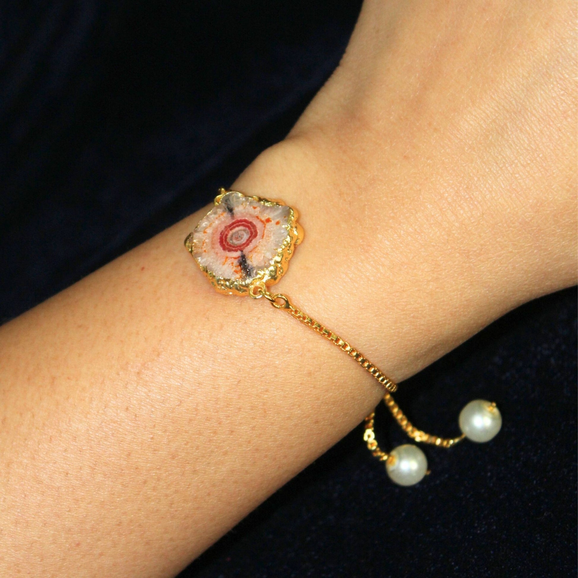 Capture the warm hues of twilight with this captivating bracelet. Featuring a luminous pink agate slice, reminiscent of a blooming desert flower, set in a golden frame, it exudes a touch of natural elegance and bohemian spirit. Style it solo for a subtle statement, or layer it with other favorites for a personalized arm party that echoes your unique style. Perfect for adding a touch of free-spirited charm to both casual and dressy looks.