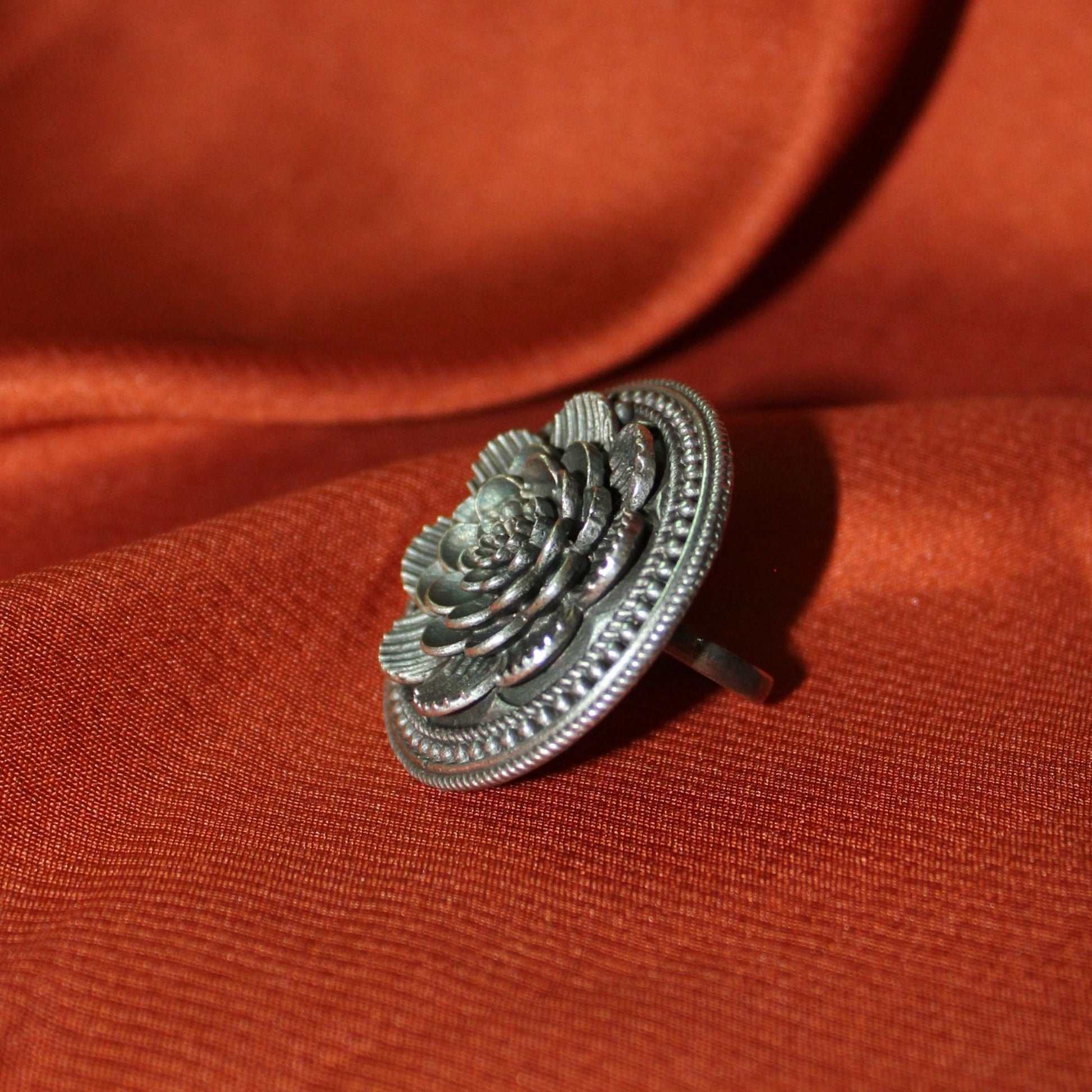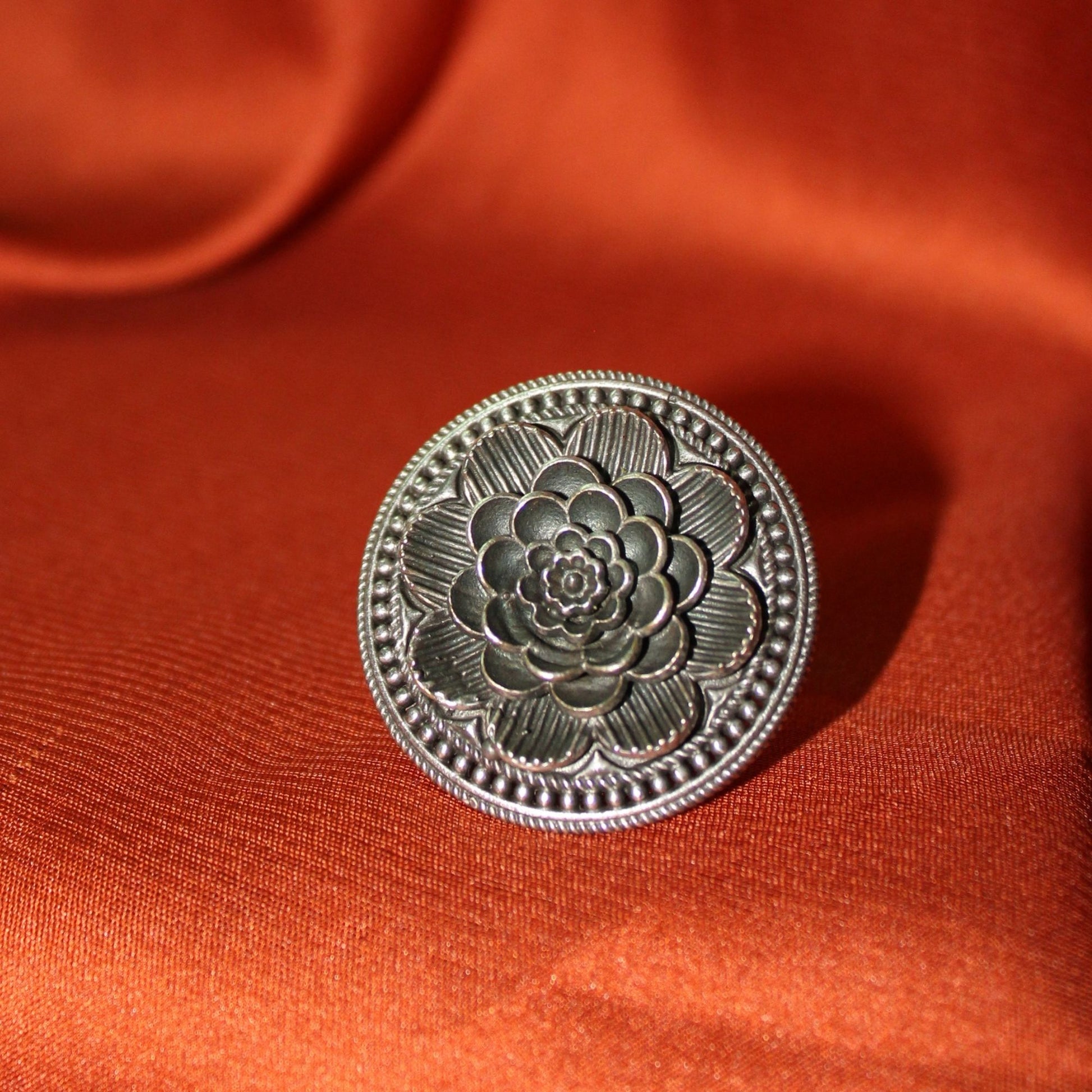 This Intricate Floral Ring is a statement piece that will elevate any outfit. The intricate floral design and oxidized silver finish create a captivating look. It's perfect for adding a touch of vintage charm to your everyday style. Pair it with a simple dress or with a casual outfit for a touch of bohemian flair.