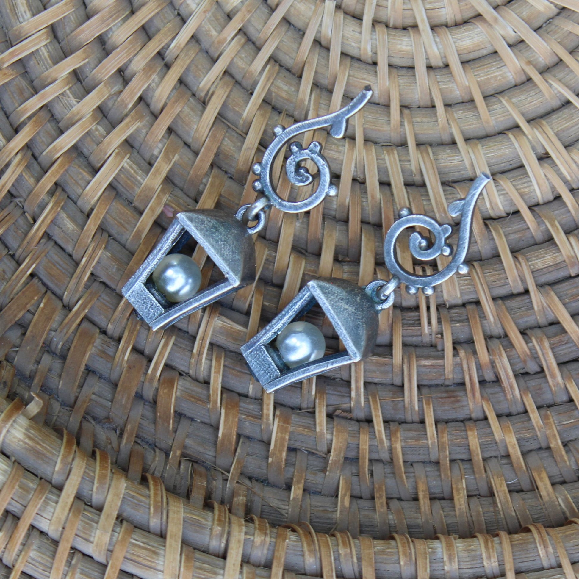 These captivating silver-toned earrings feature a charming lantern design, adorned with a delicate pearl. The intricate detailing and secure push-back with stopper closure make them both elegant and comfortable. Perfect for adding a touch of vintage romance to your evening attire or a touch of whimsy to a casual ensemble.
