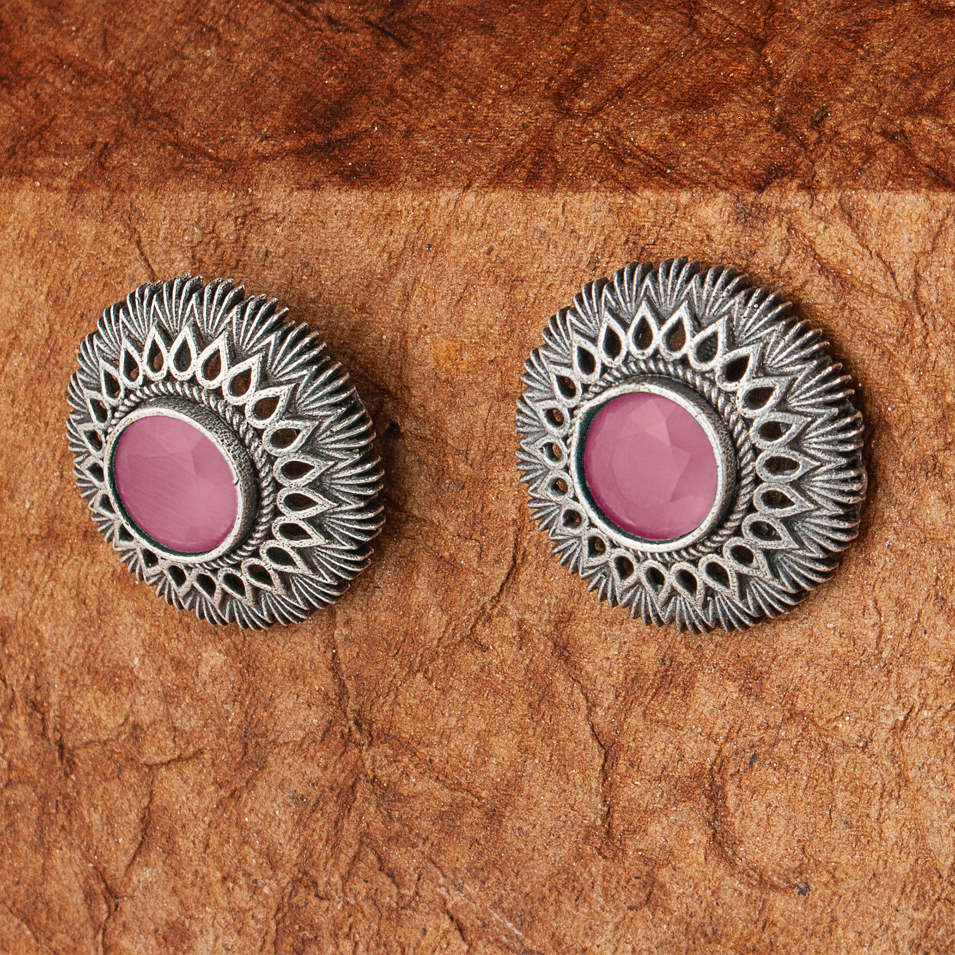 These sophisticated earrings feature a pink hue and a dark oxidized finish. They offer a refined and modern look, suitable for various occasions.