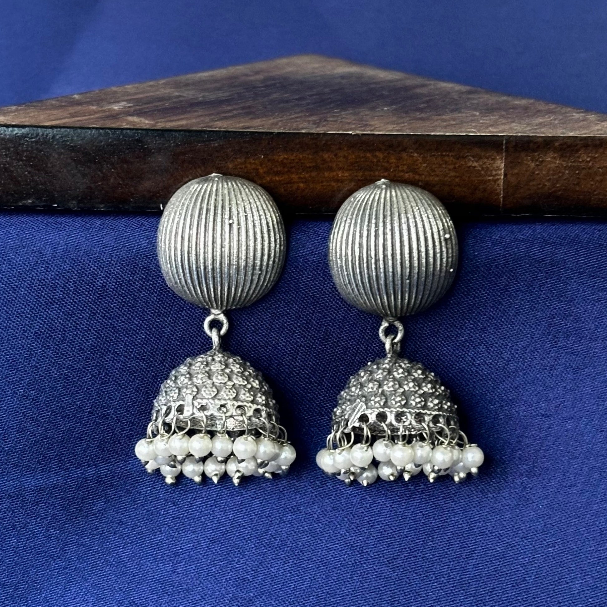 Elegant silver jhumka earrings with a vintage-inspired look. Features a grooved dome, embellished bell, and tiny white pearl drops. Perfect for adding a traditional touch. Pushback closure.