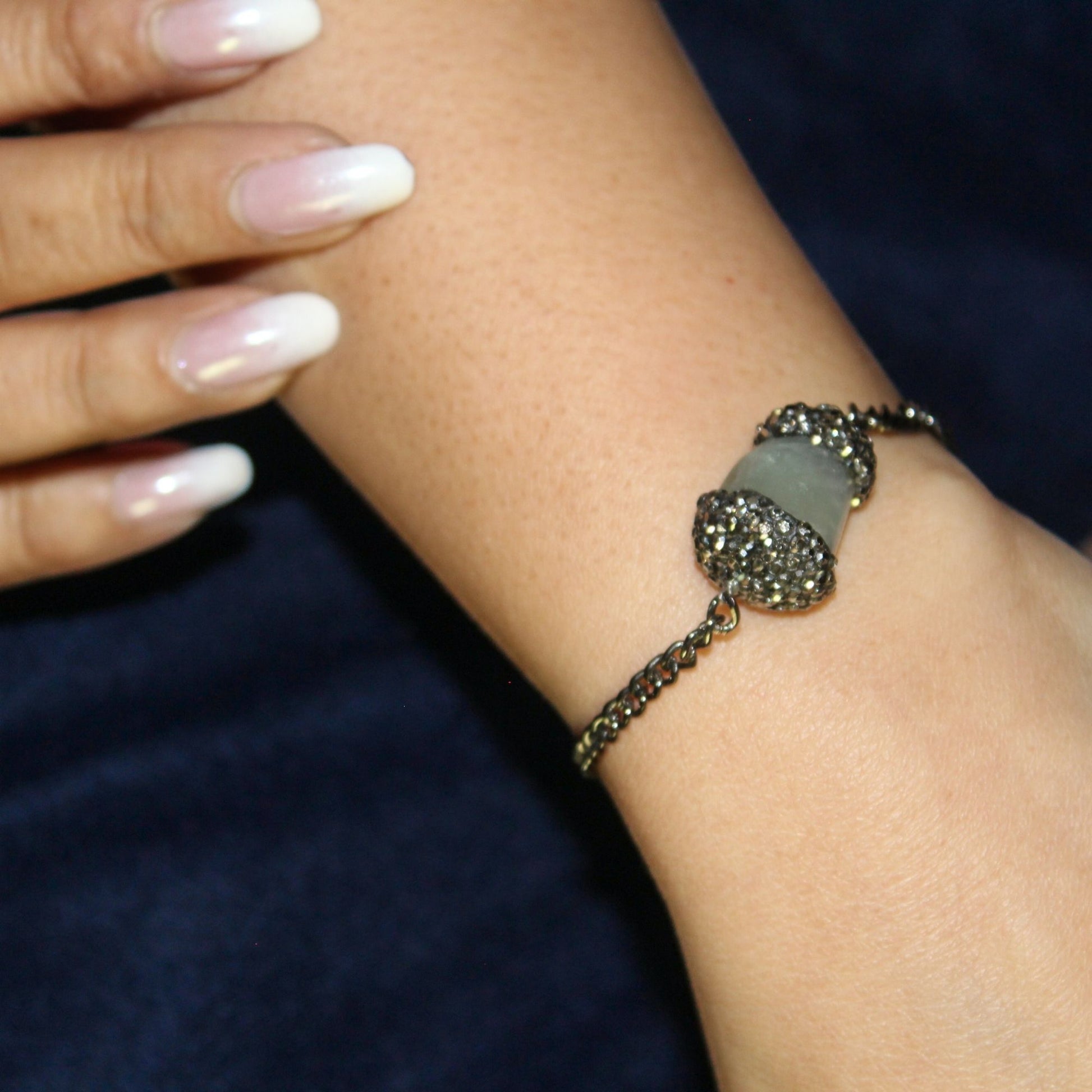 Embrace the mystique of twilight with this captivating bracelet. Featuring a luminous, textured grey stone, reminiscent of a twilight sky, nestled between sparkling accents on a sleek band, it exudes a subtle yet striking elegance. Style it solo for a touch of understated glamour, or layer it with other bracelets for a personalized arm party that reflects your unique style. Perfect for adding a touch of modern sophistication to both casual and evening looks.