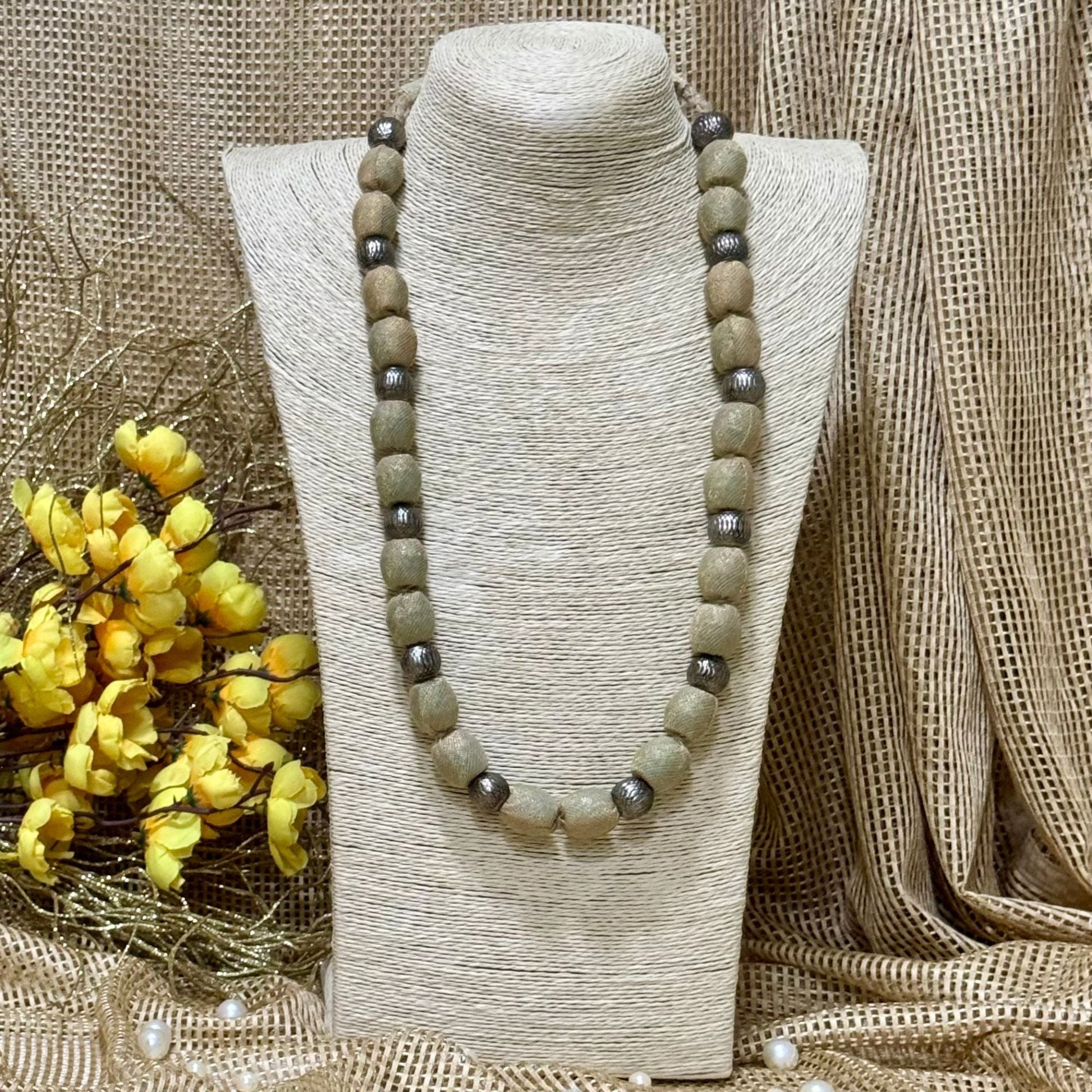 Single layer handmade fabric beaded necklace in metallic tissue highlighted with metal beads with an adjustable clasp. This zero-waste neckpiece is light and comfortable to wear and blends well with indian and western wear. Comes packed in a fabric pouch and is a perfect gifting option.