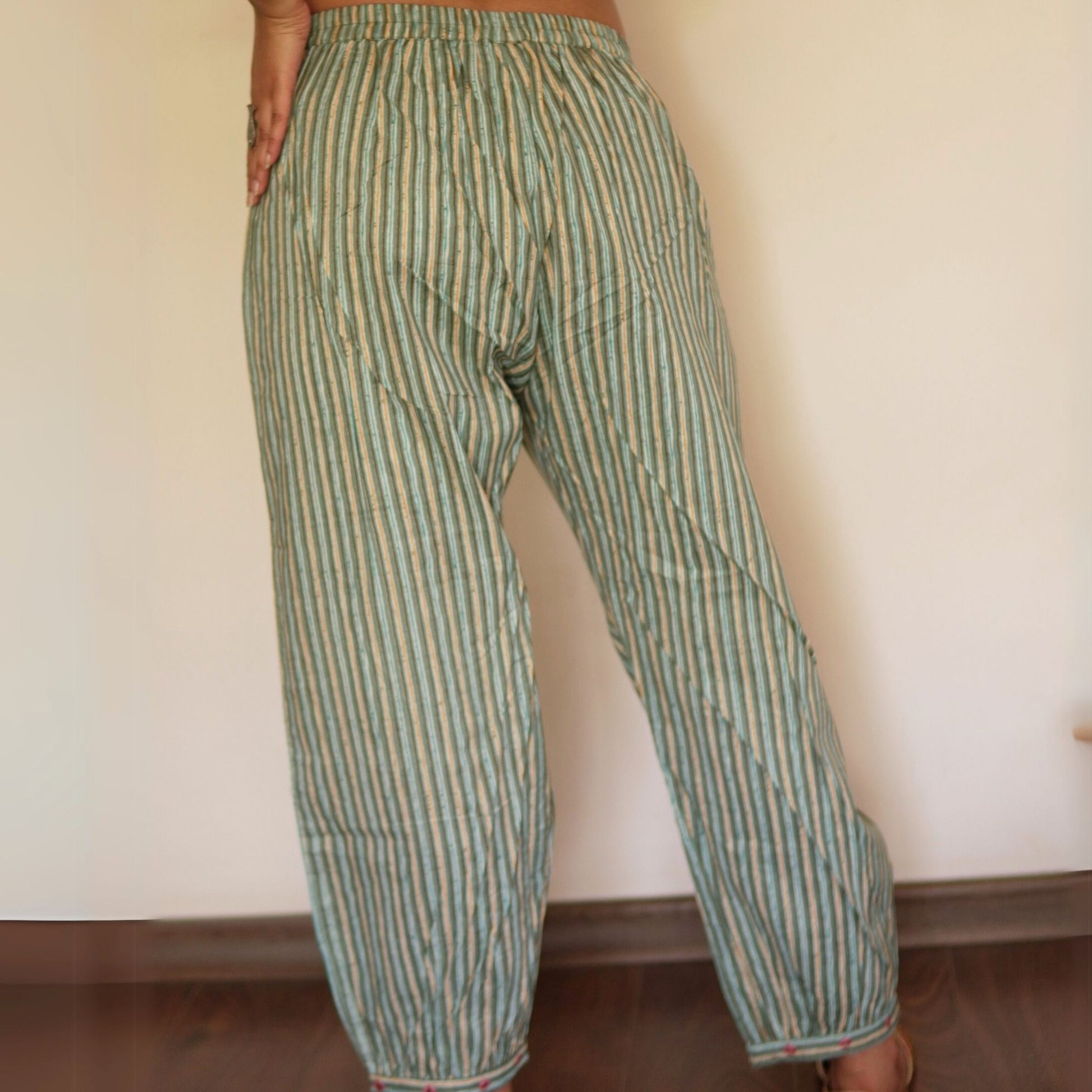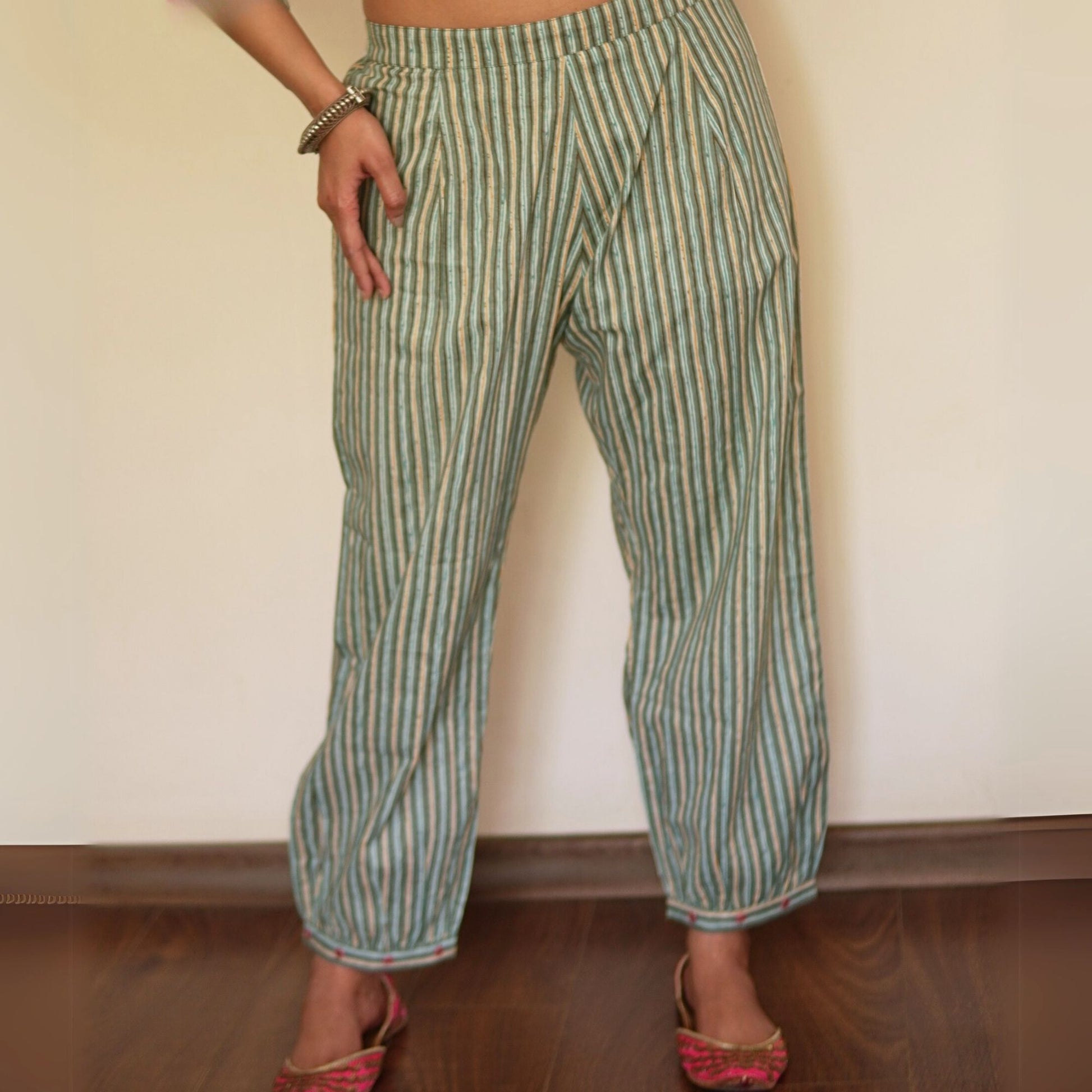 This teal floral kurta features mirror work and zari on the placket and sleeves. The structured collar and band sleeves add edge, while the striped Afghani salwar with mirror hem completes the look for effortless daily or work wear.