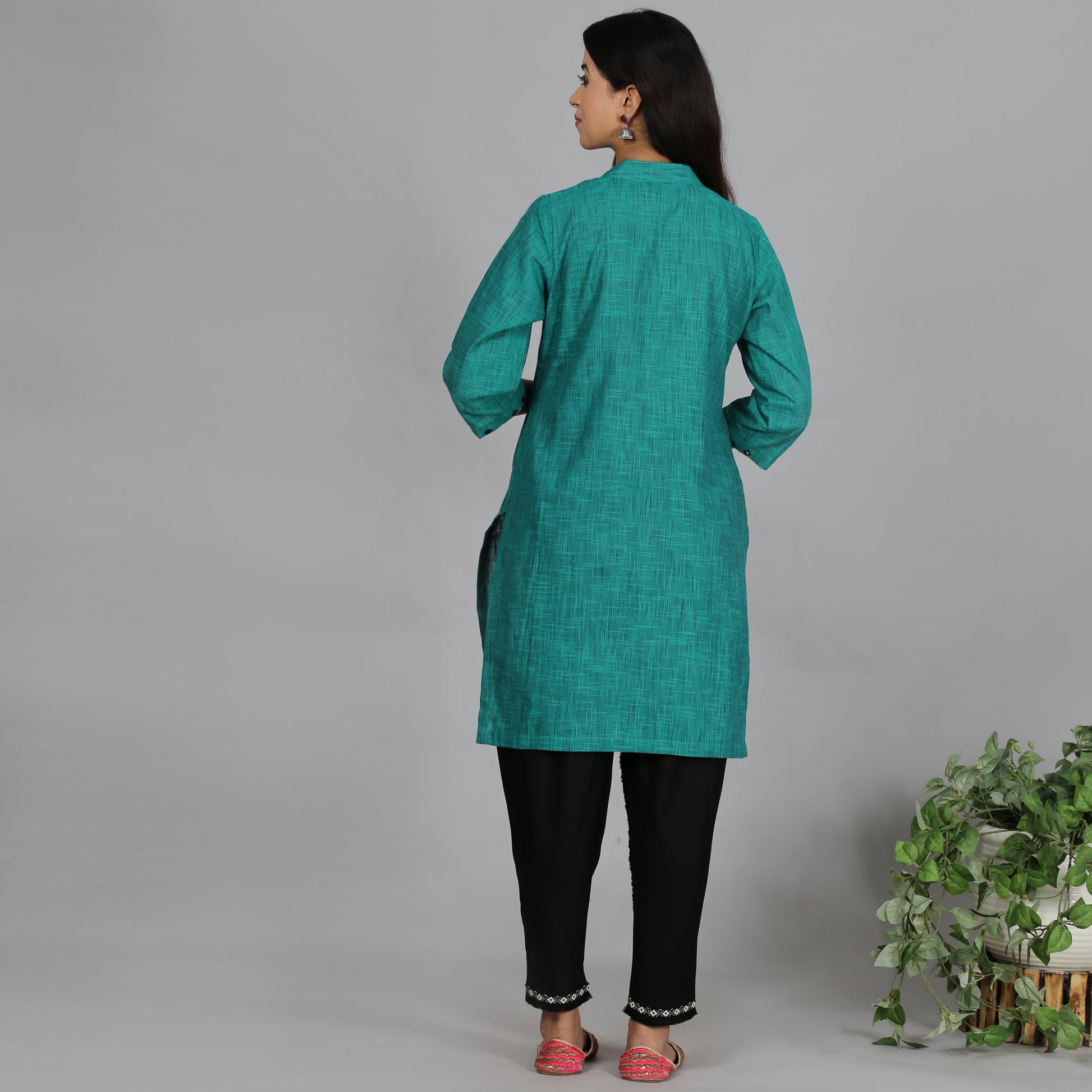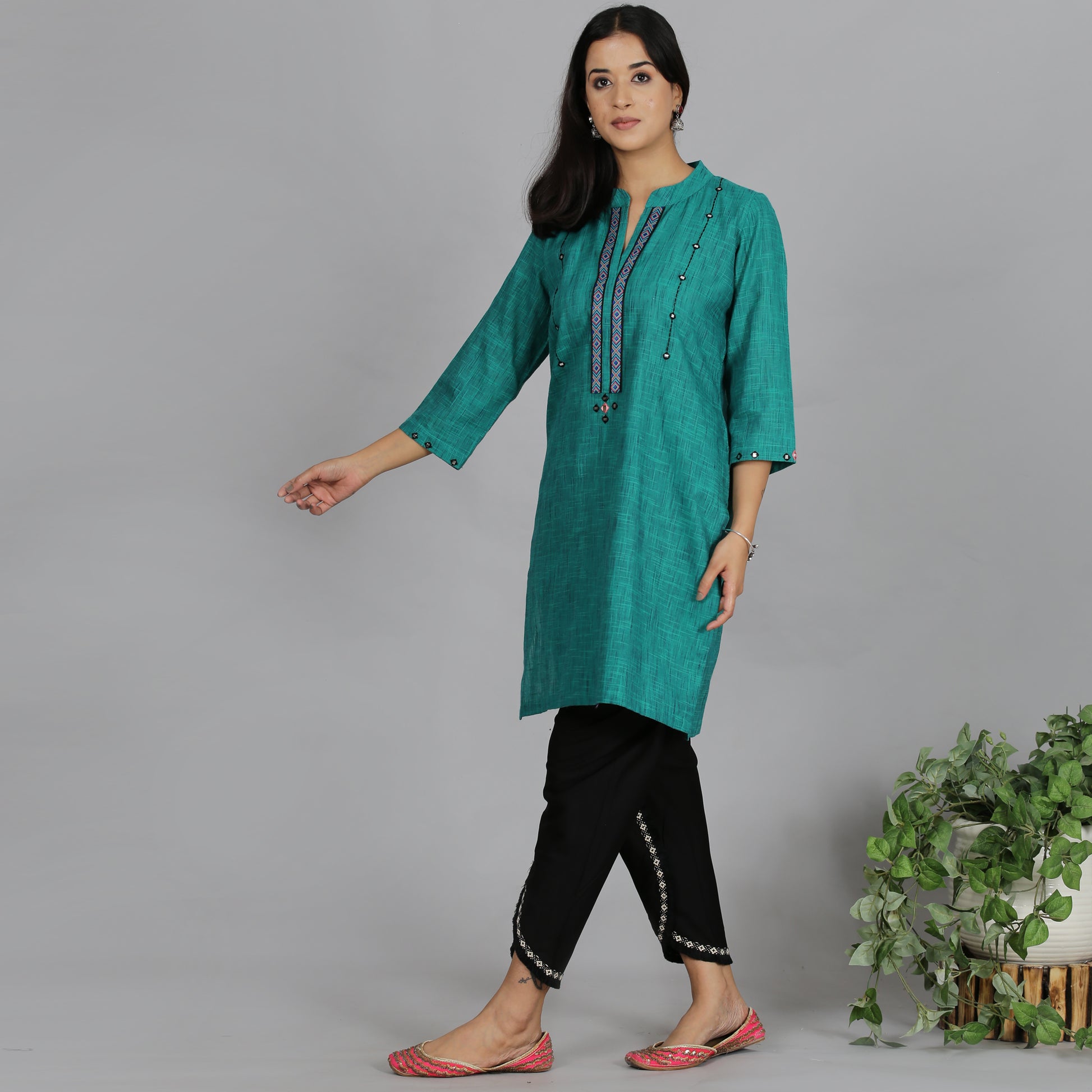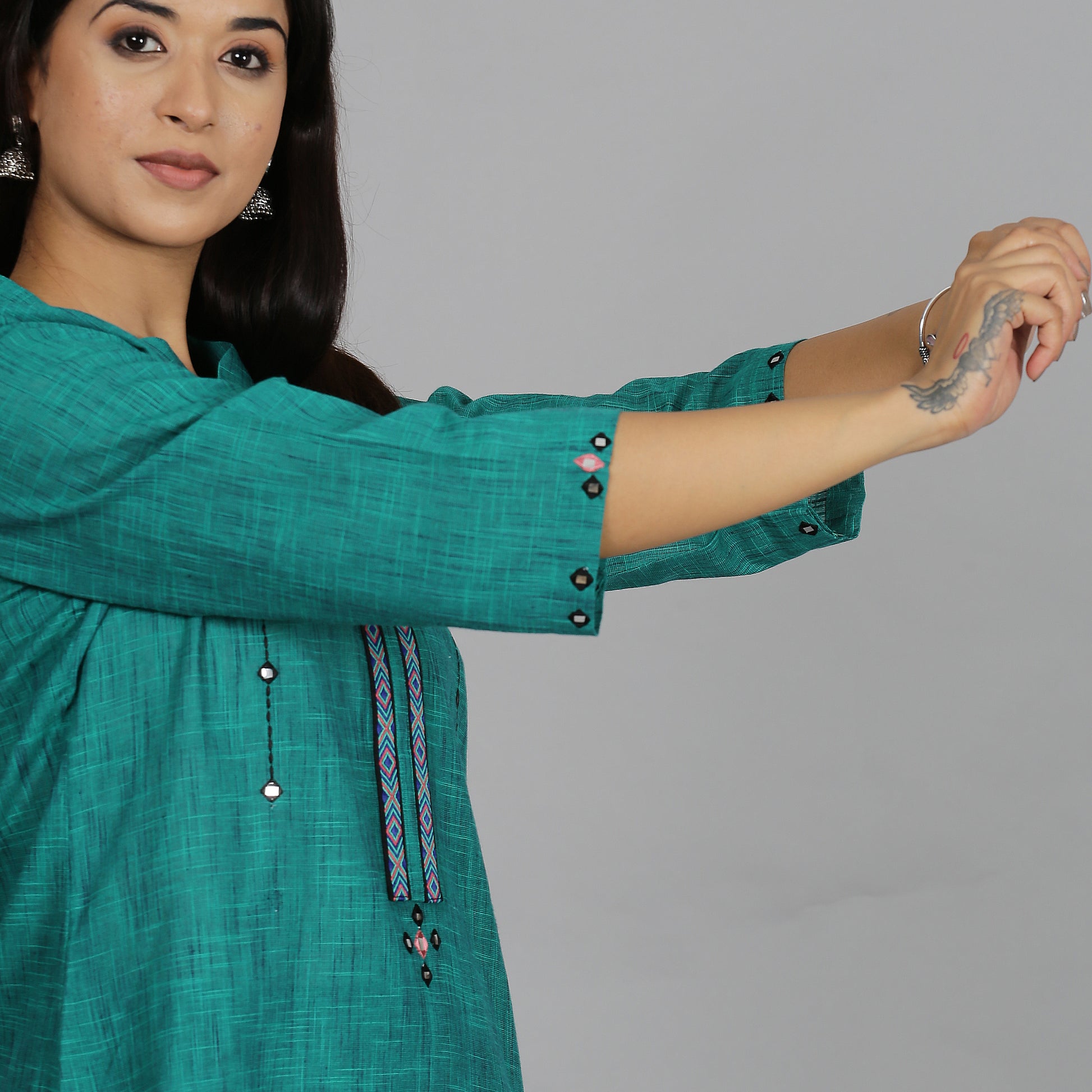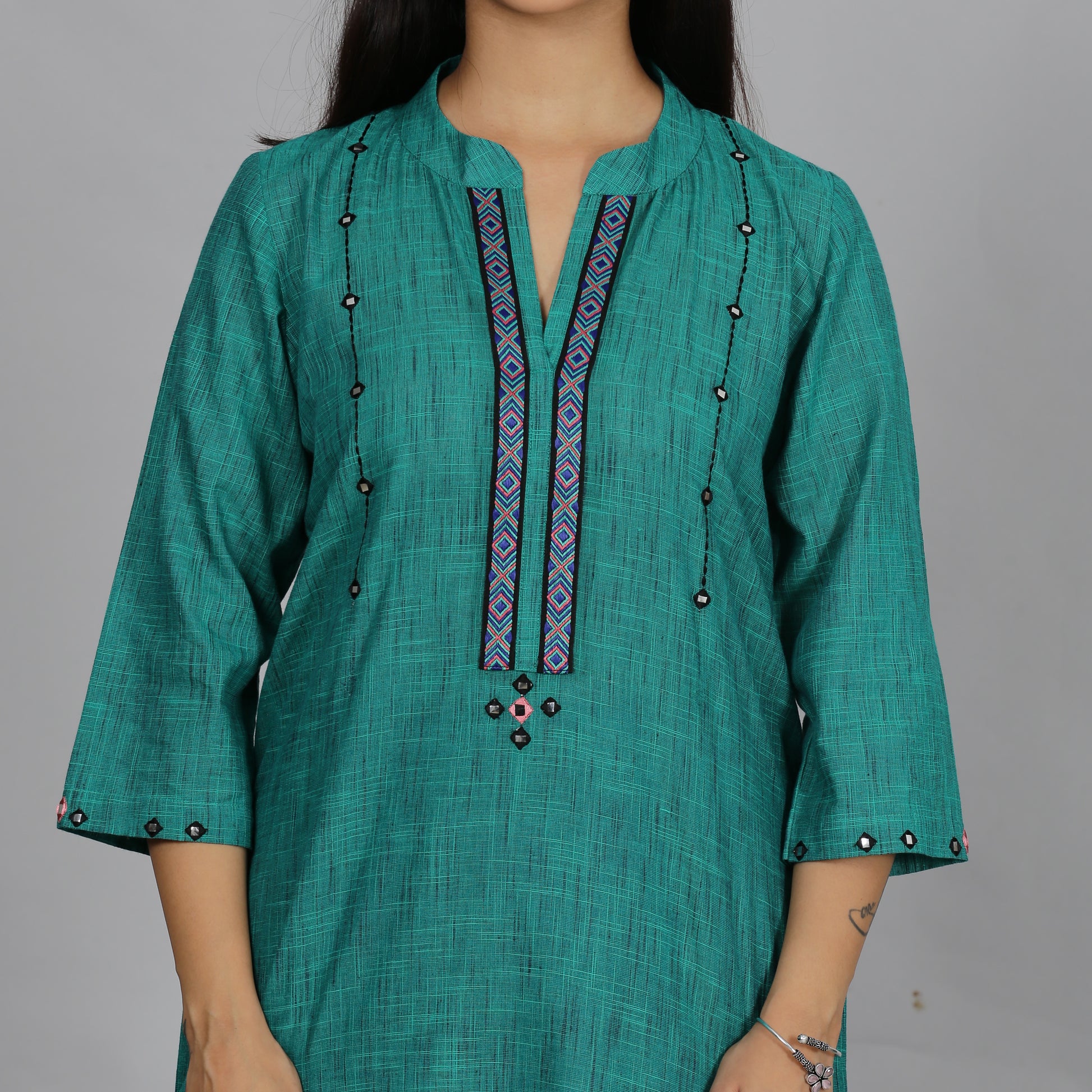 Crafted for both comfort and style, this teal south cotton kurta features mirror work embroidery & tape detailing on the neck. Pair this short kurta with dhoti pants adorned with tassel lace for a modern yet traditional look.