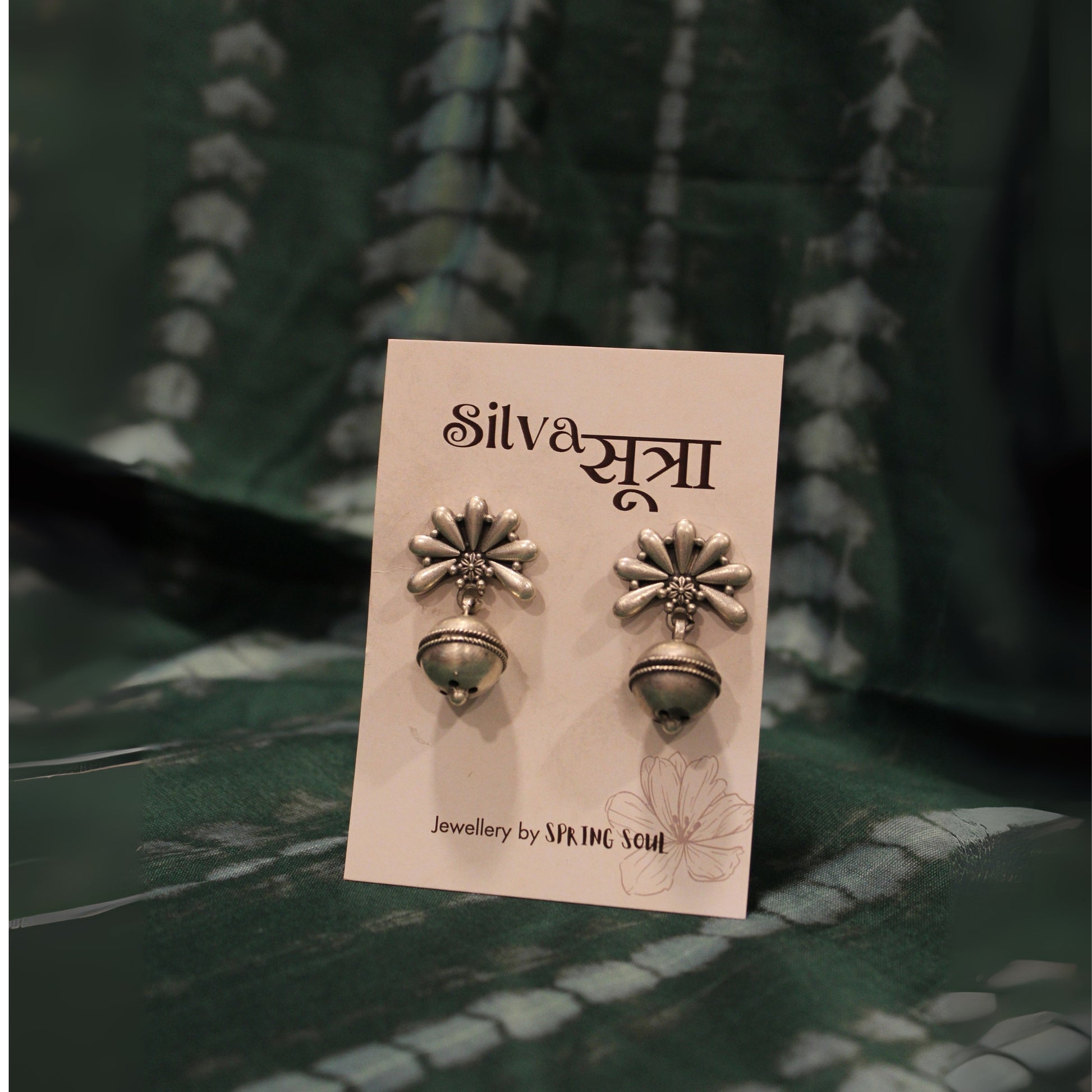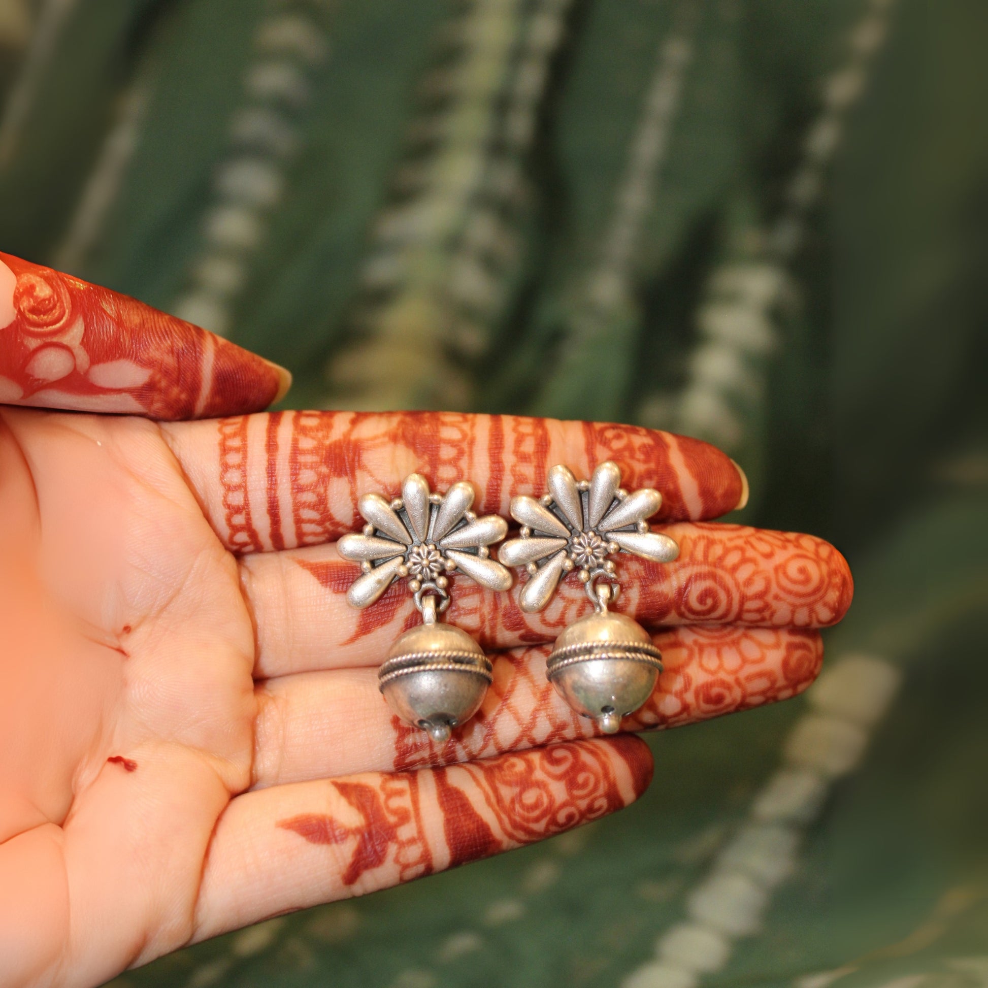 Oxidized silver-toned jhumka earrings featuring a delicate floral stud. A traditional bell-shaped drop with textured detailing hangs below, creating a charming and classic look. These elegant earrings have a pushback closure.