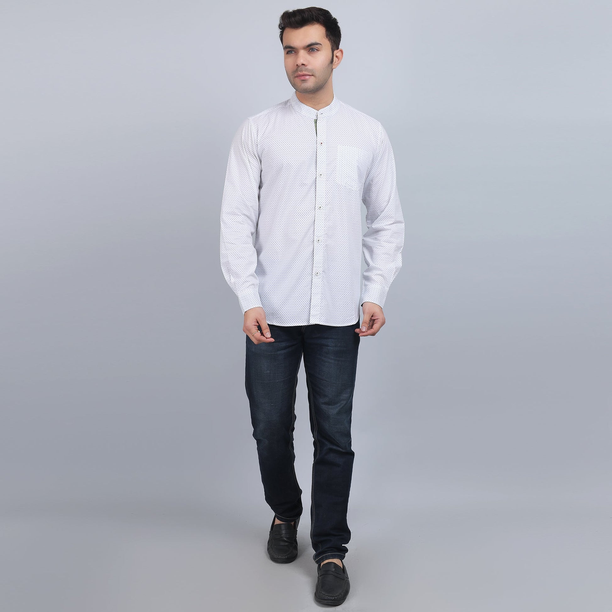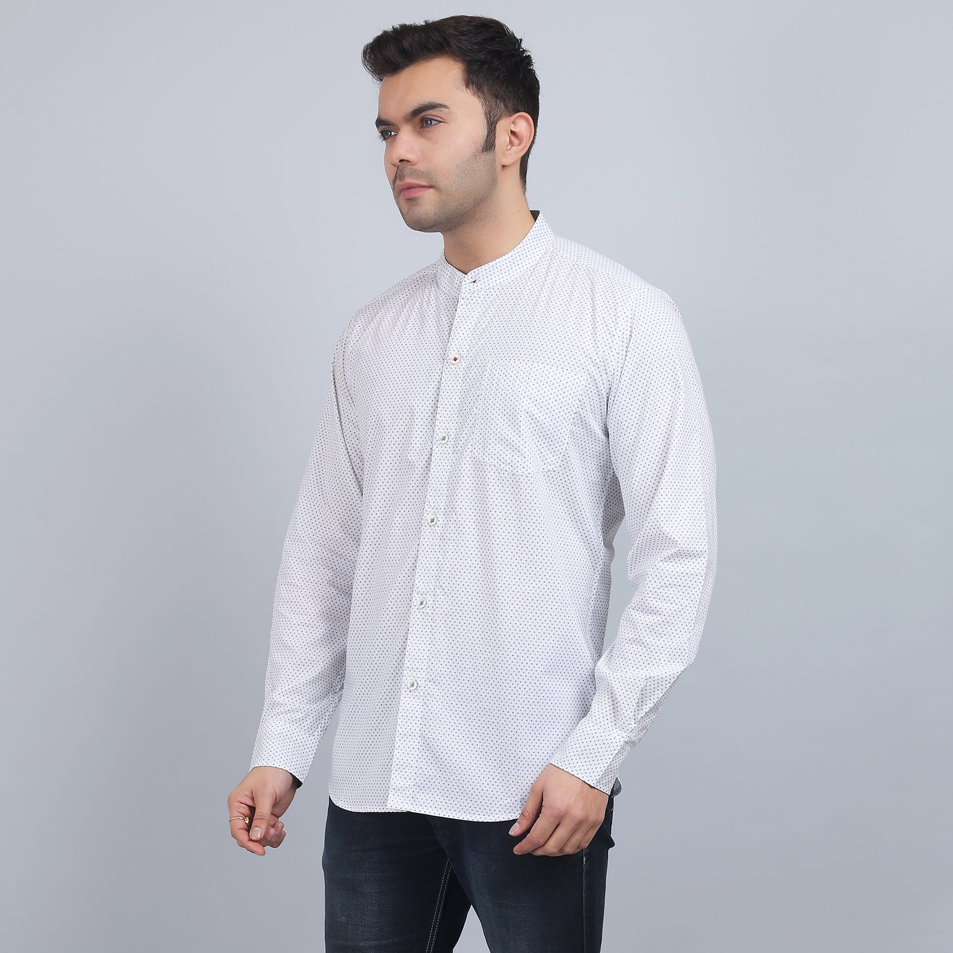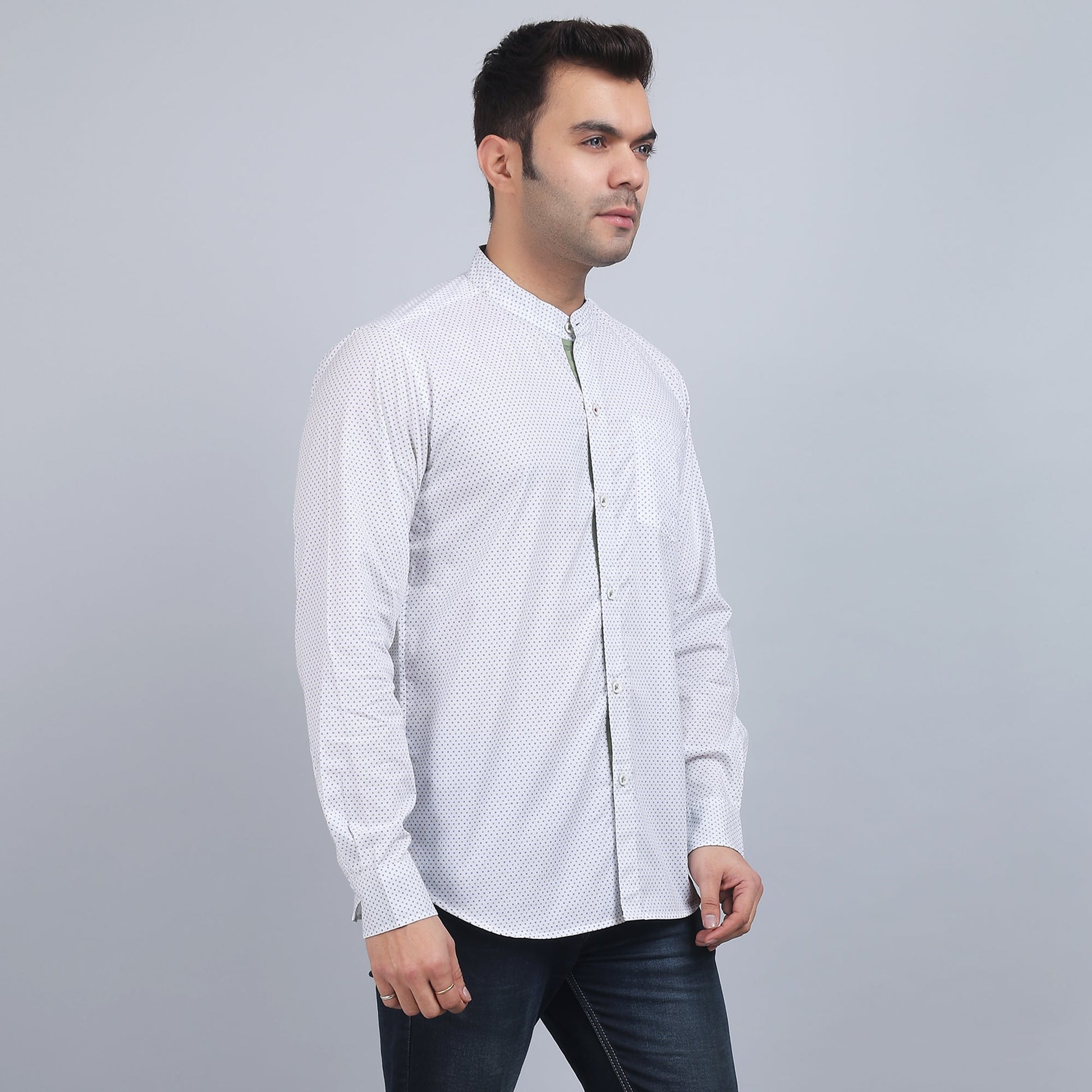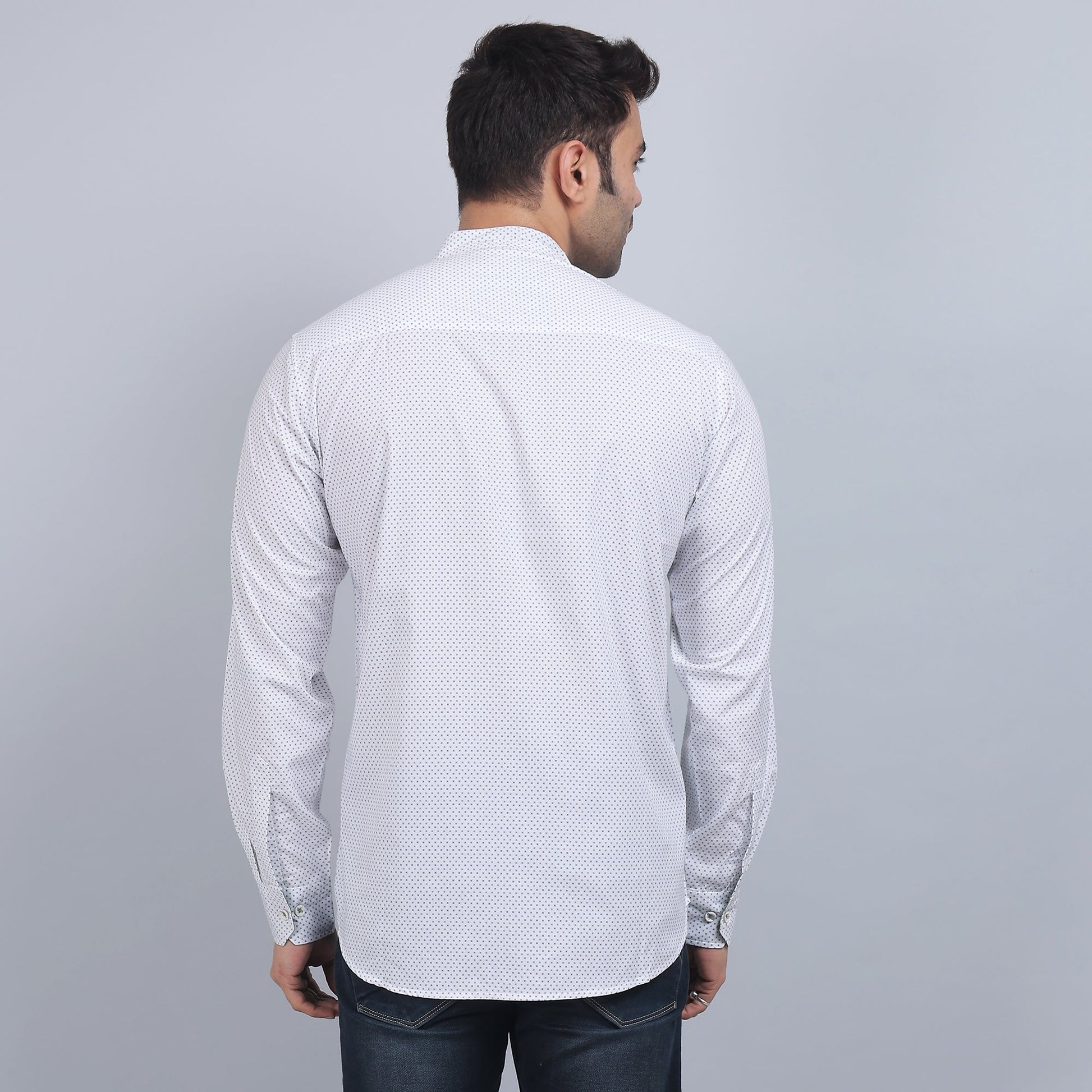 White printed smart casual pure cotton full-sleeves band collar shirt in comfort fit. Ideal for social gatherings and for keeping comfort with a professional trendy appearance.