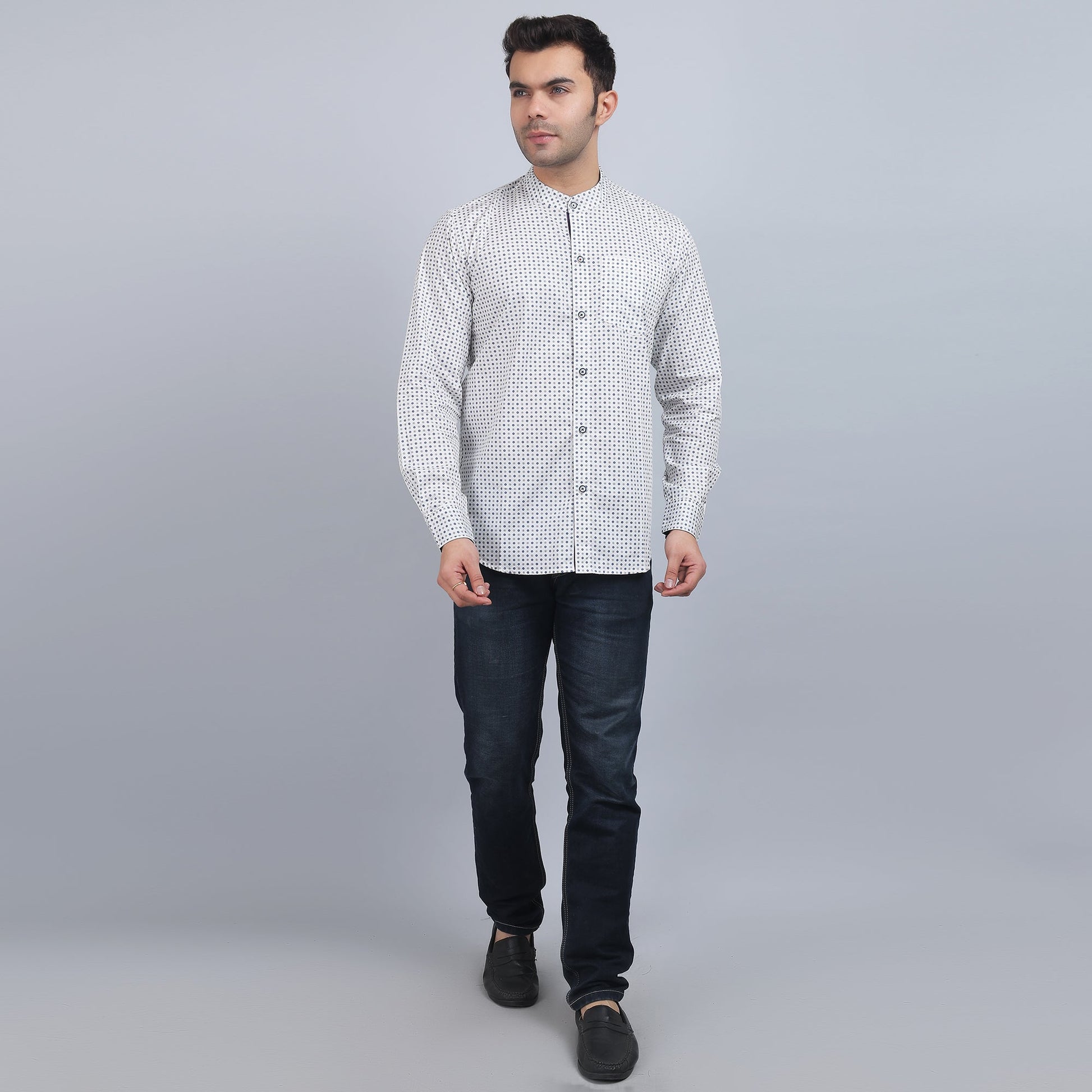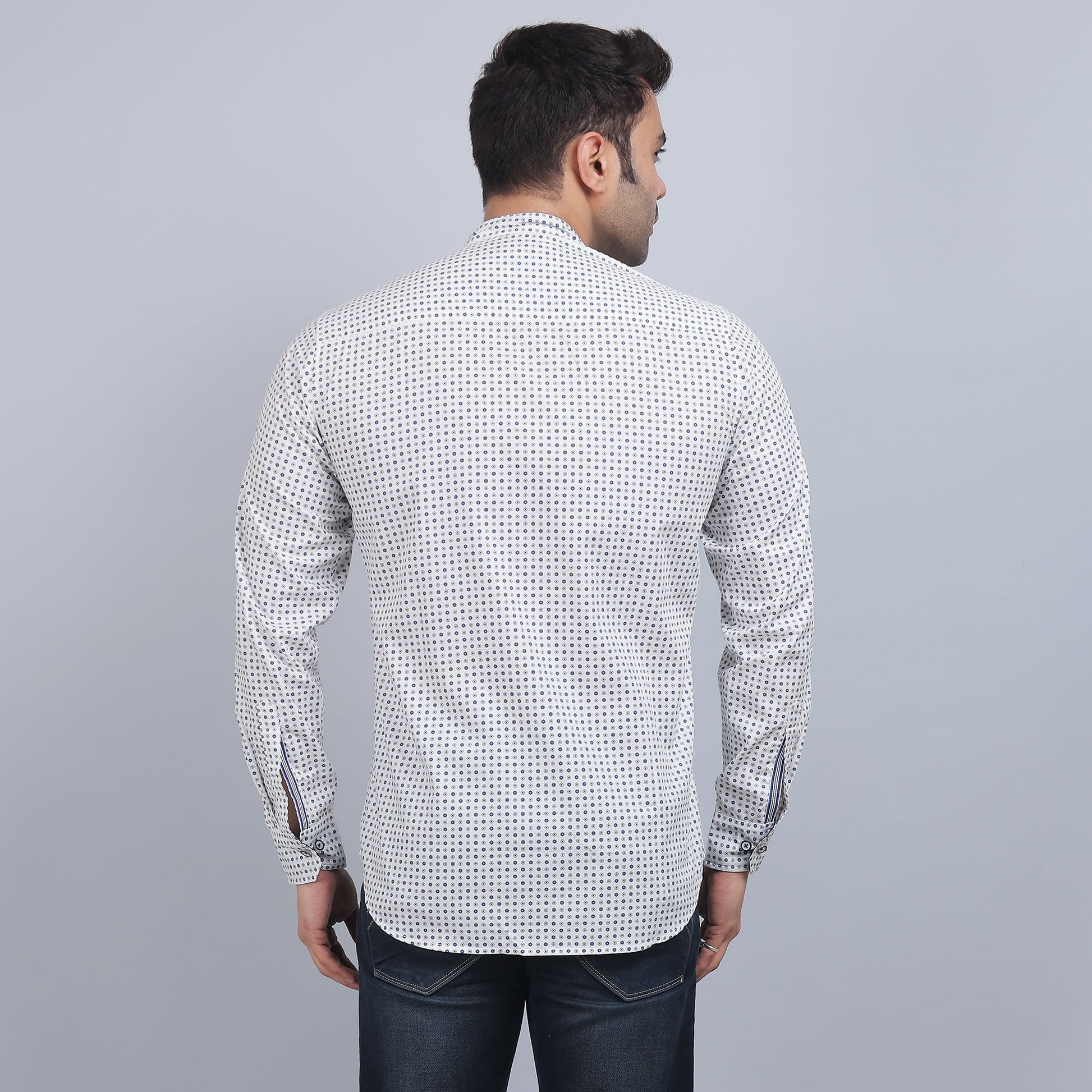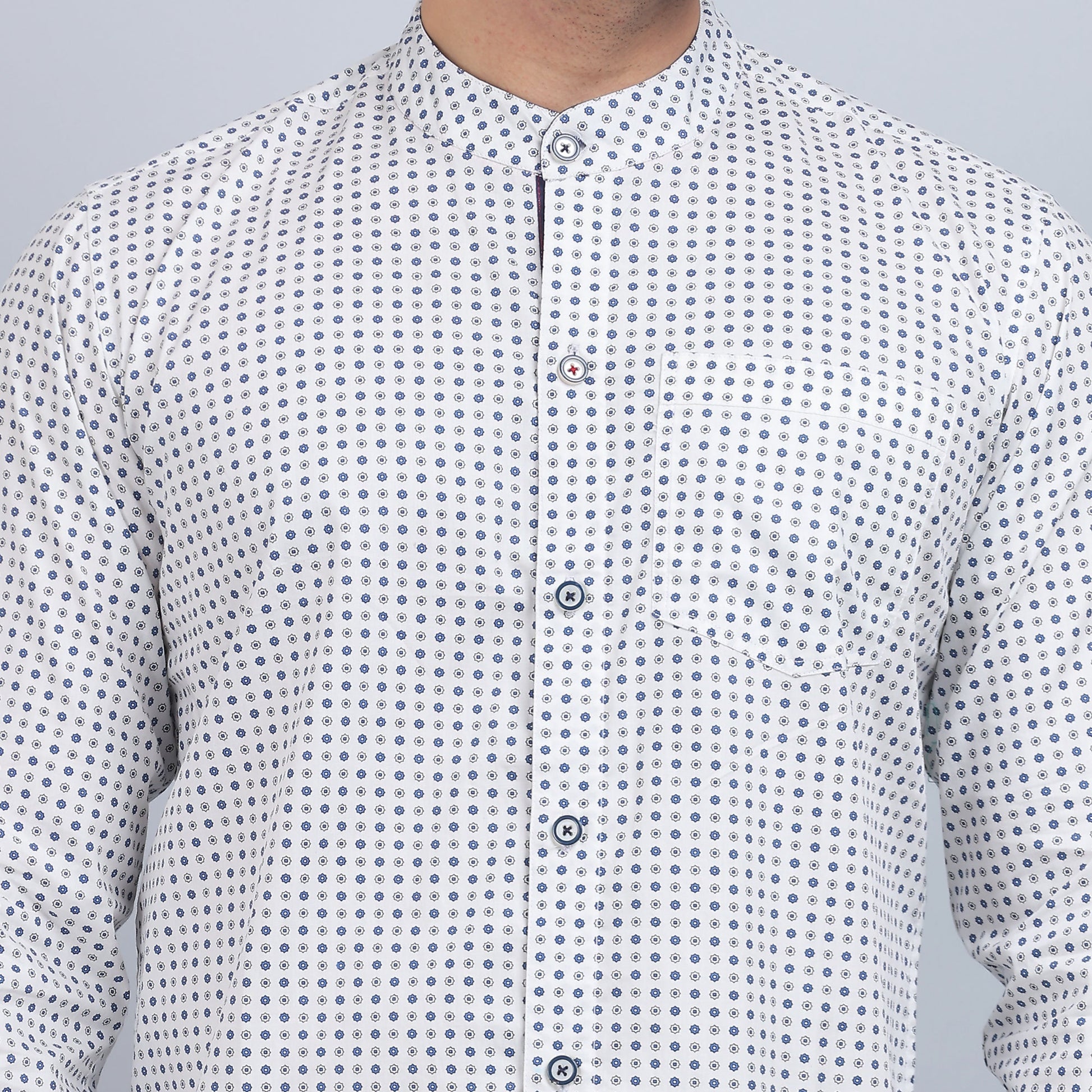 White printed smart casual pure cotton full-sleeves band collar shirt in comfort fit.Ideal for social gatherings and for keeping comfort with a professional trendy appearance.