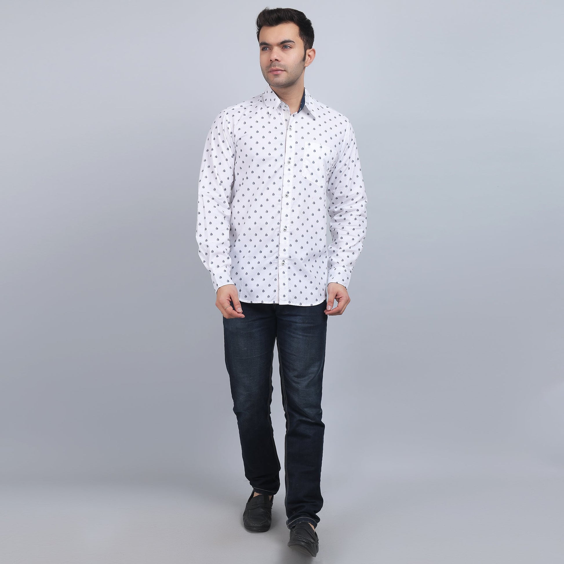White Printed smart casual pure cotton Full-sleeves regular collar shirt in comfort fit. Ideal for social gatherings and for keeping comfort with a professional trendy appearance.