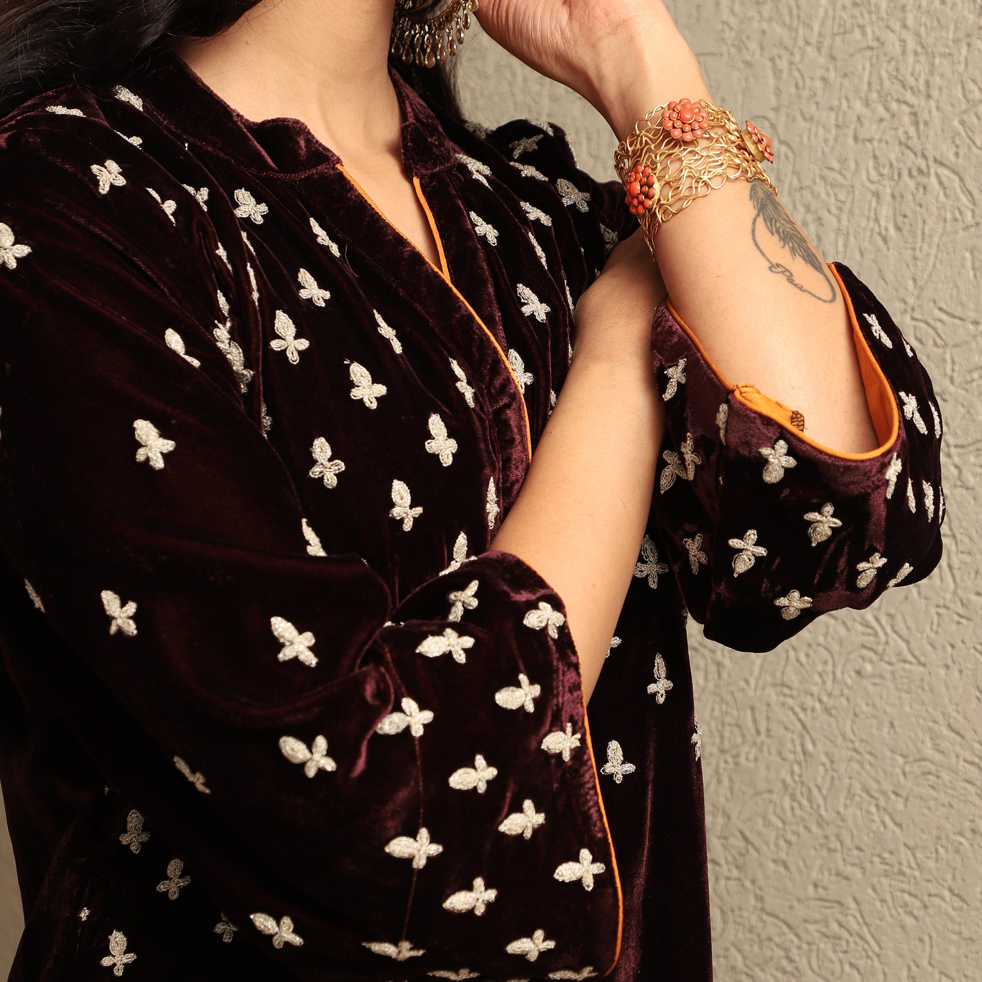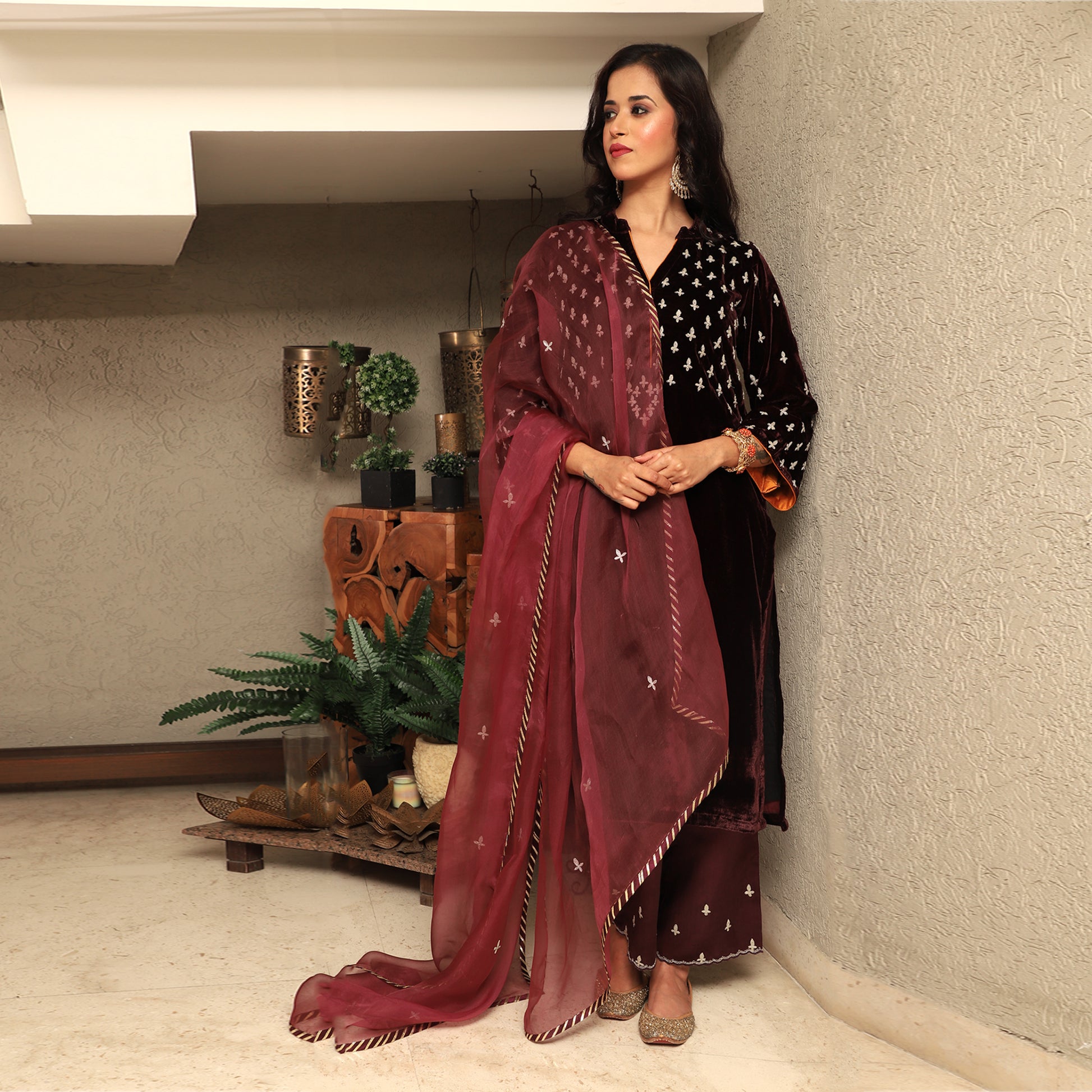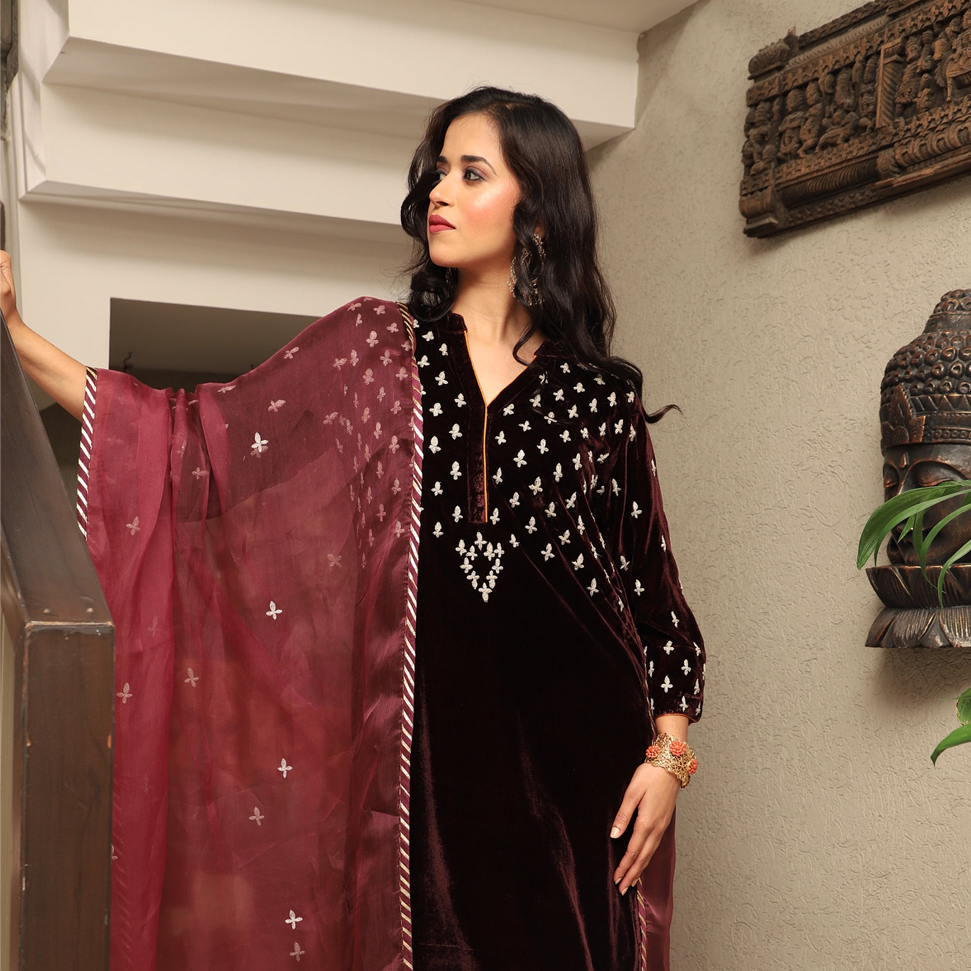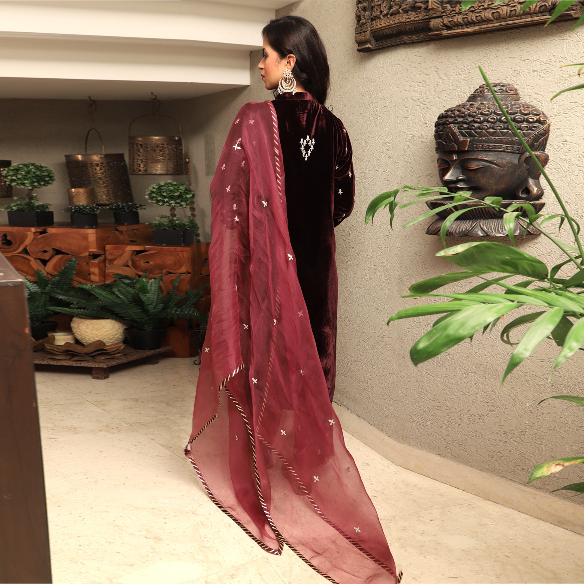 Wine Embroidered Velvet Kurta Set with Mashru Silk Pants & Organza Dupatta