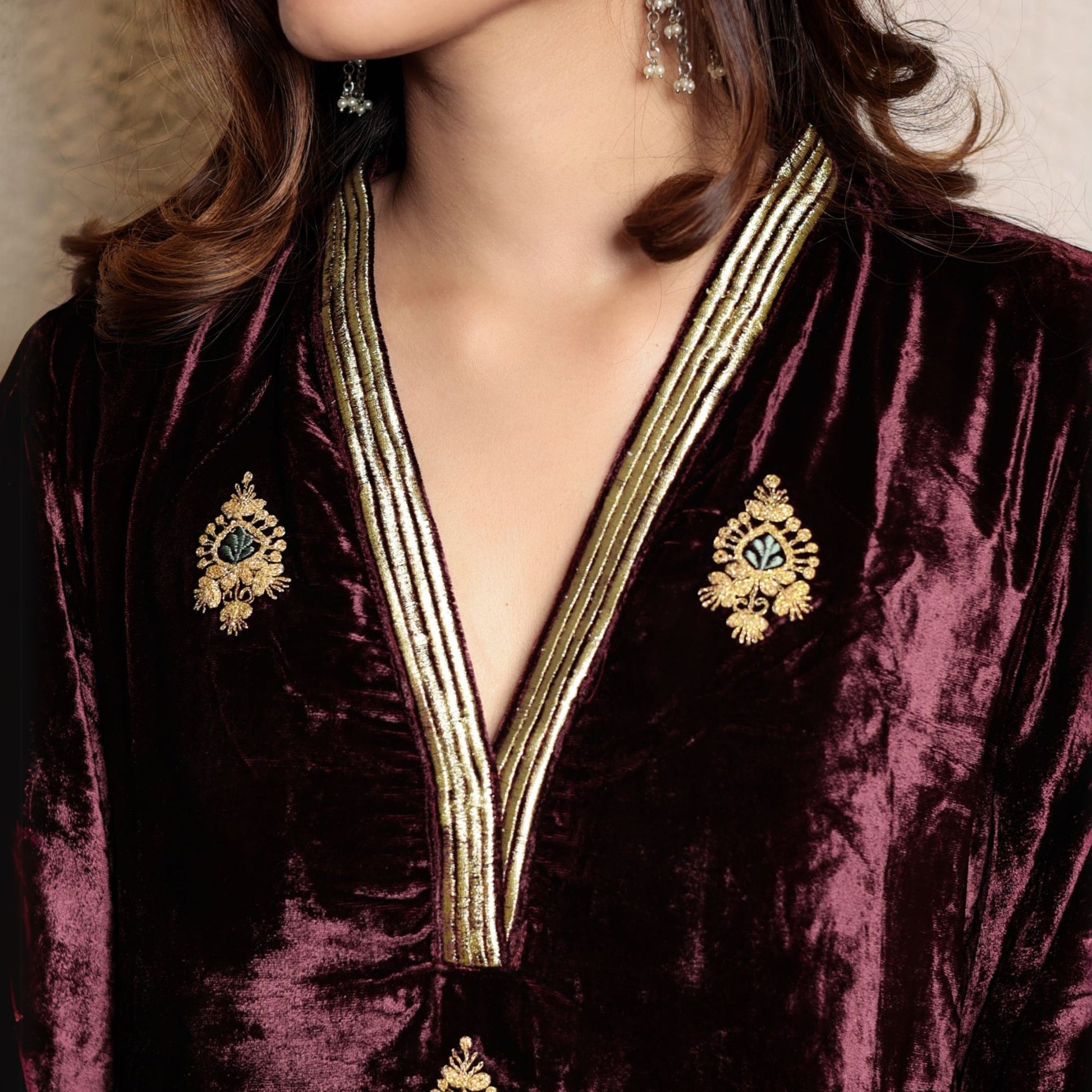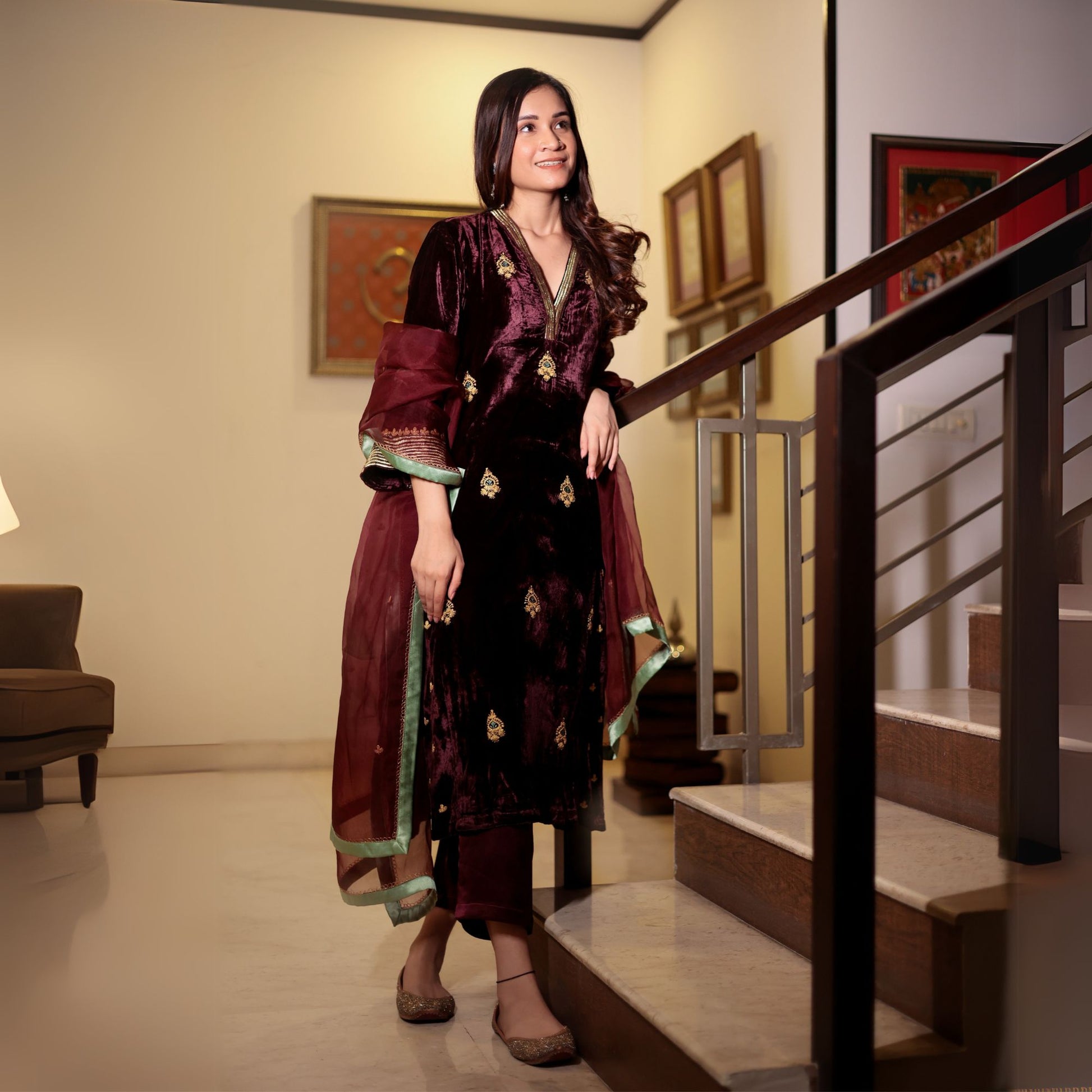 Wine embroidered kurta with dori work on the body and zari work on the neckline and sleeves. It is paired with matching velvet pants and an embroidered organza dupatta with contrasting finish.