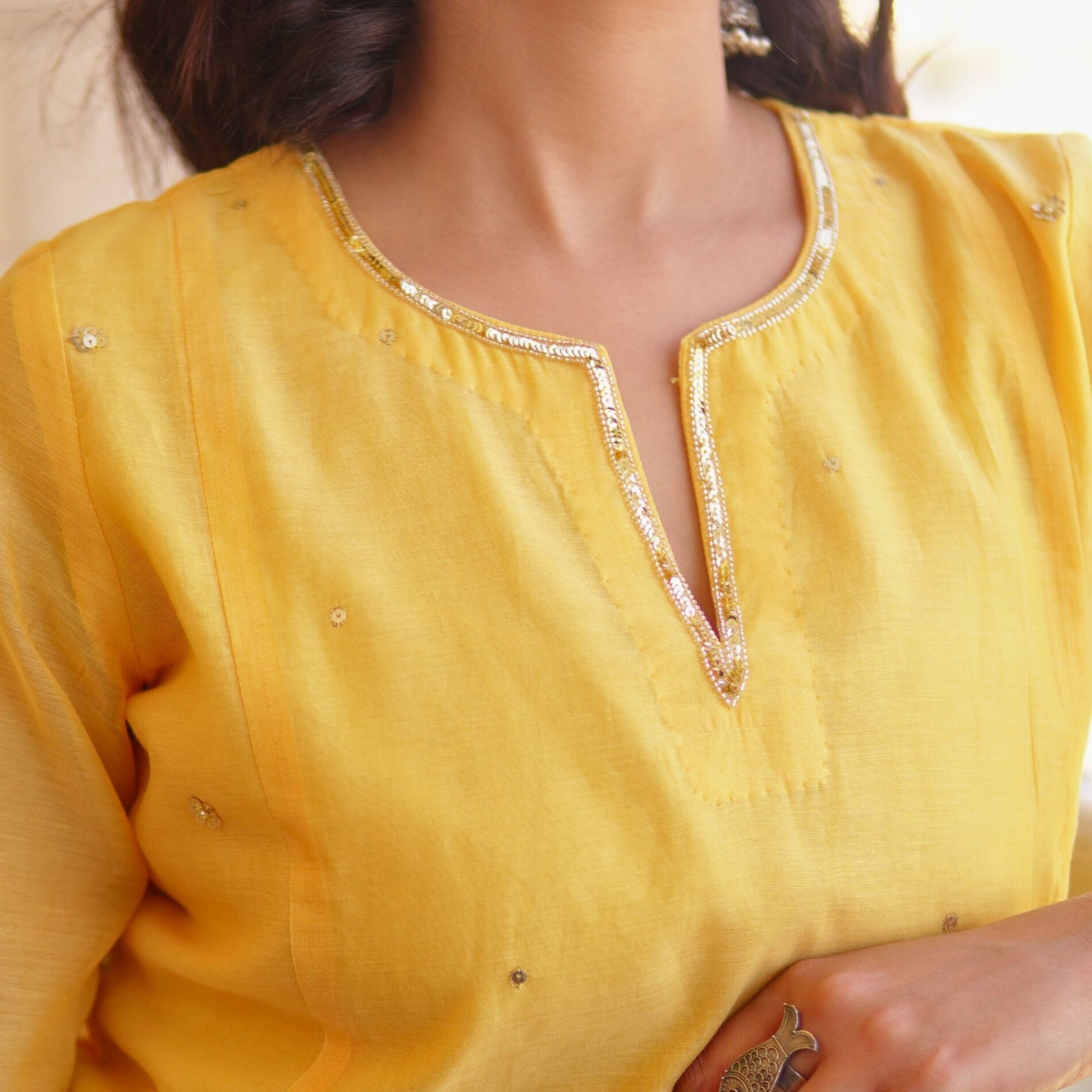 Bright and graceful, this yellow Chanderi A-line kali kurta set features a sequin-sprayed bodice and hand-embellished neckline with beads and sequins. It is perfectly paired with matching chanderi bottoms, it’s a vibrant pick for semi-formal gatherings.