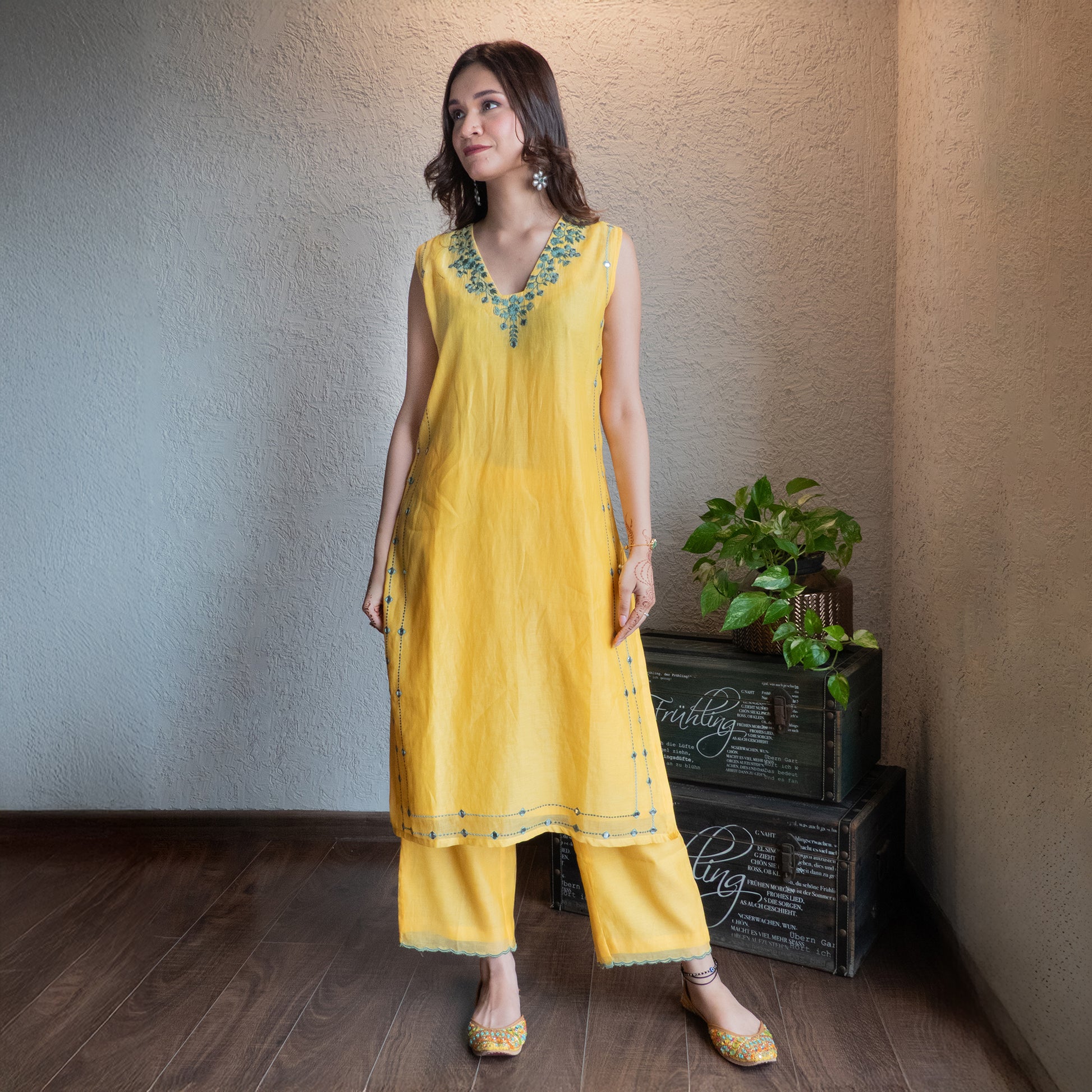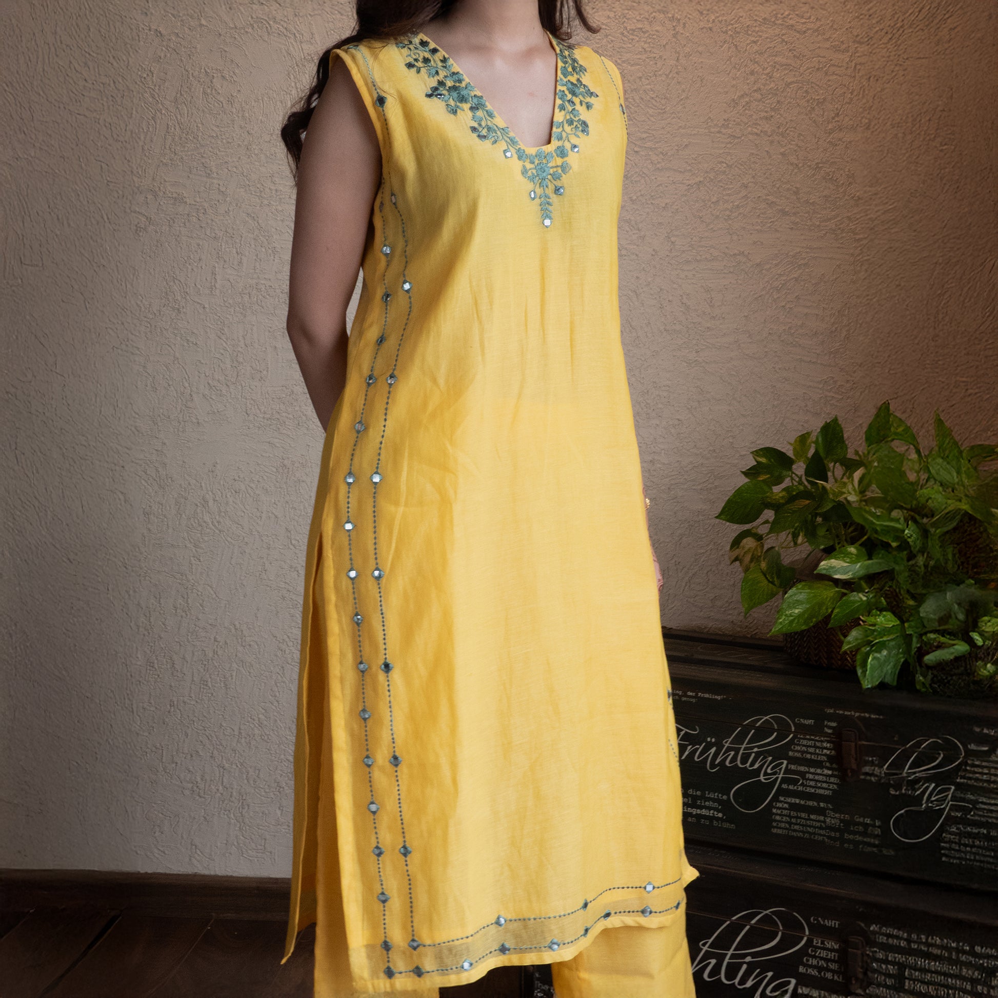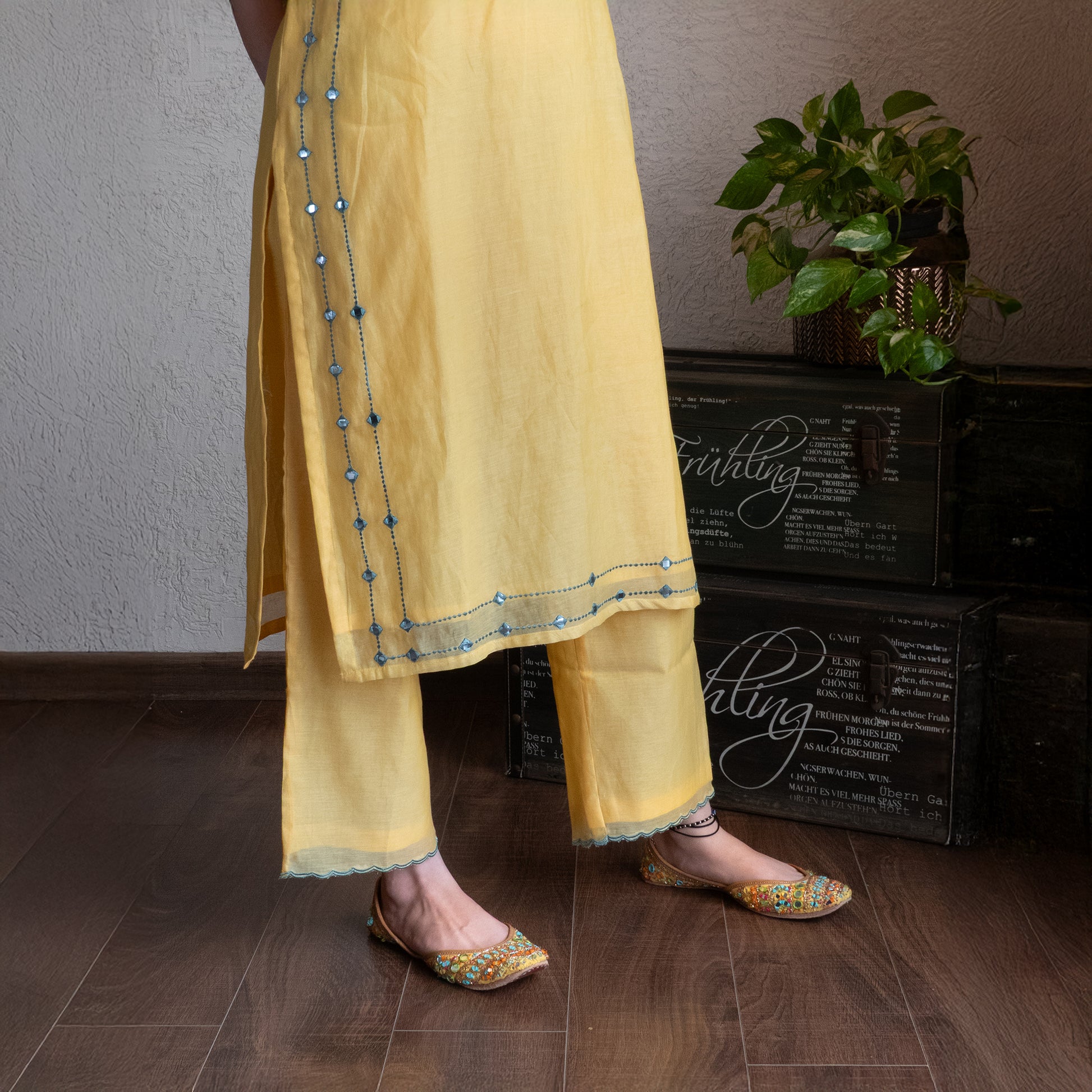 Yellow Chanderi Mirrorwork embroidered Kurta set with Dupatta