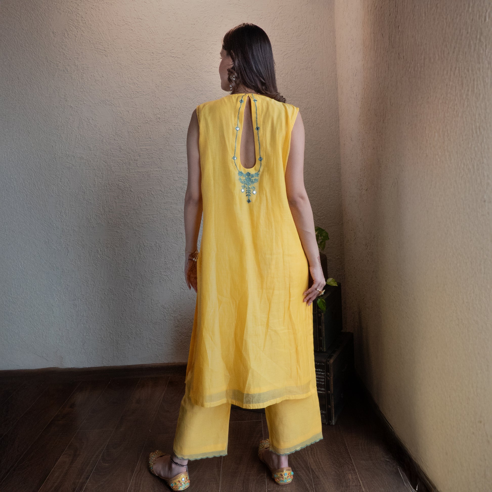 Bright and cheerful, this yellow Chanderi kurta set shines with intricate mirrorwork embroidery on the kurta. Featuring scalloped hems on the pants and a colorblocked green and yellow dupatta with minimal gota edging, it’s a perfect blend of traditional charm and modern simplicity.