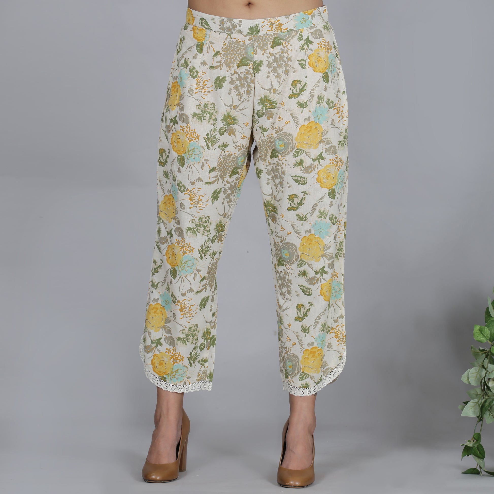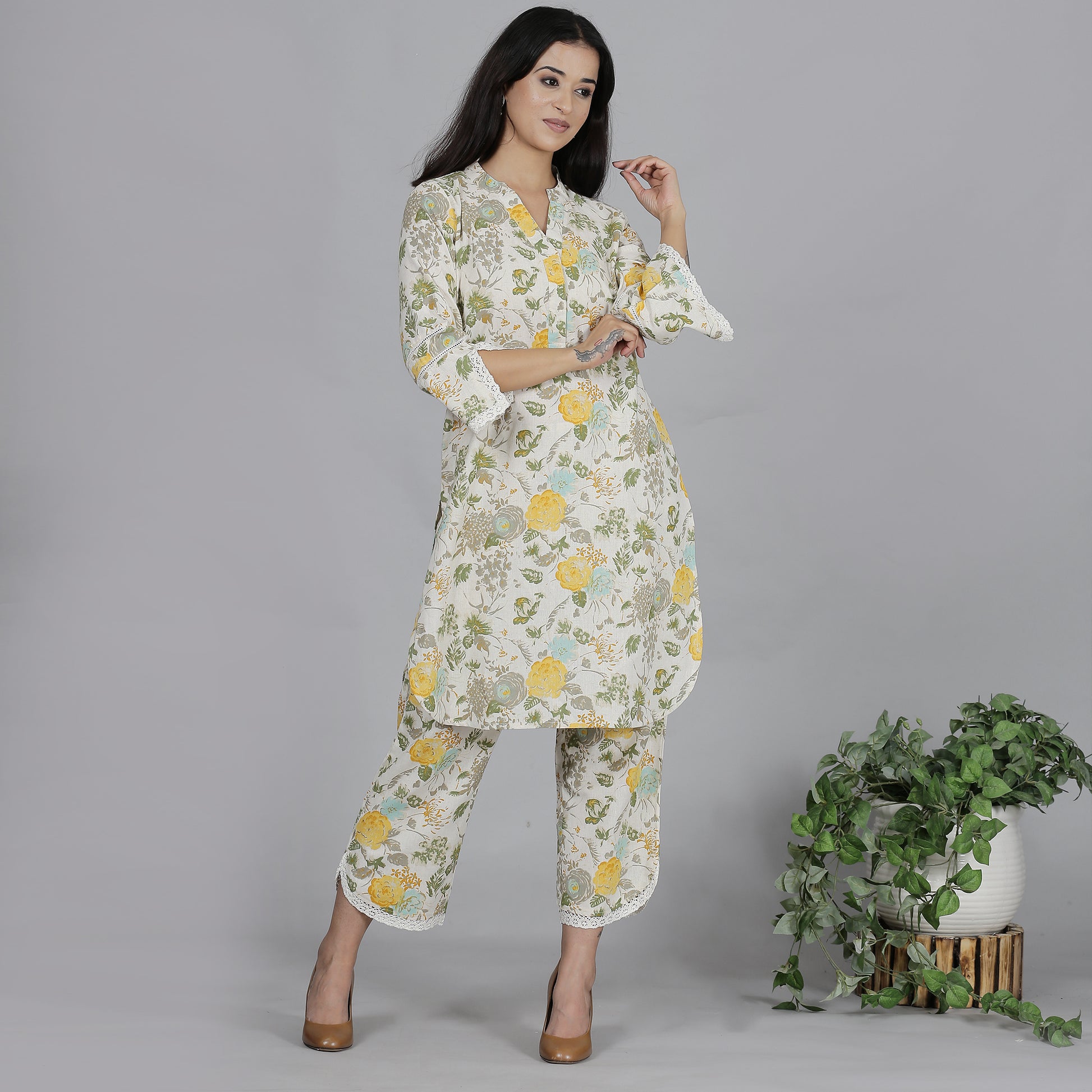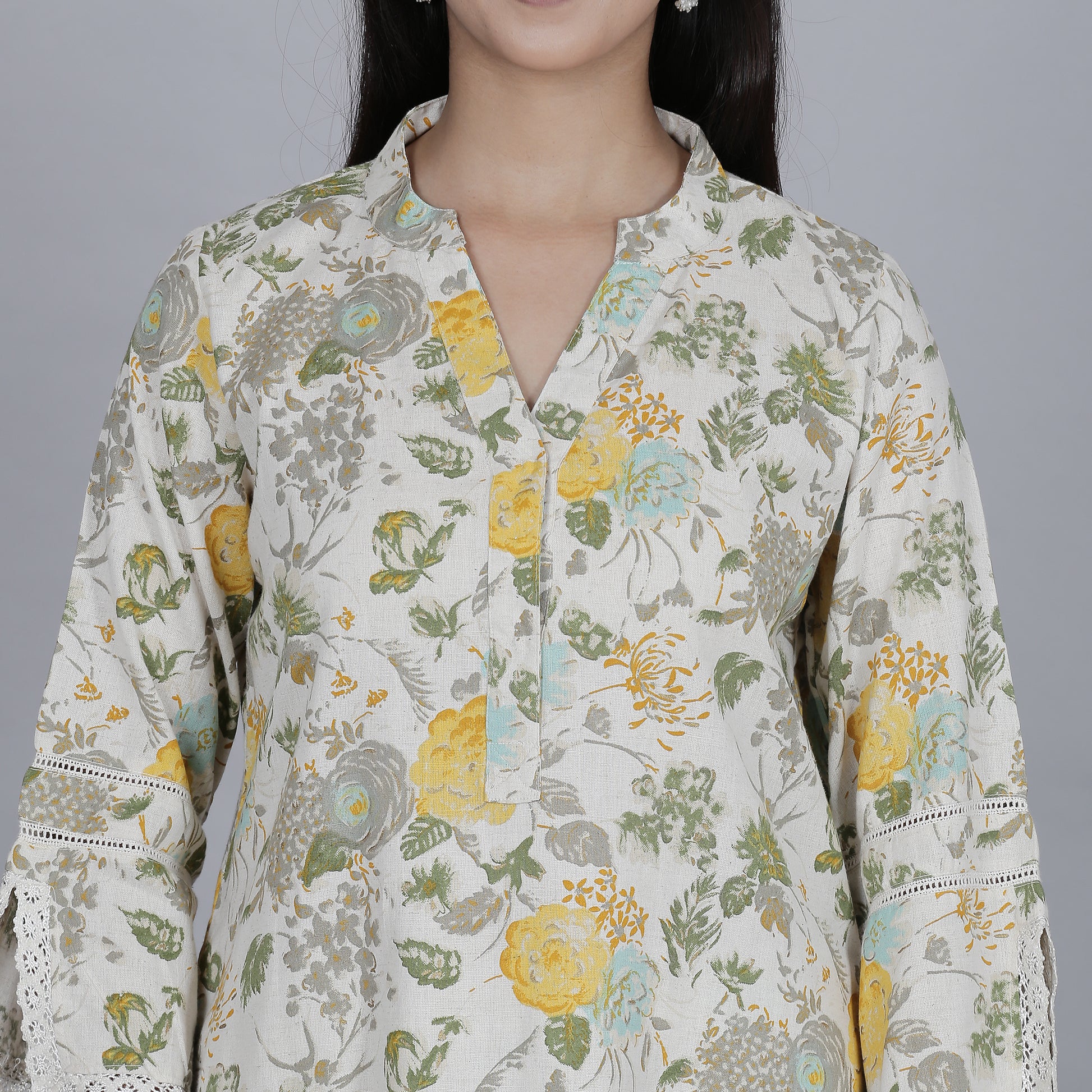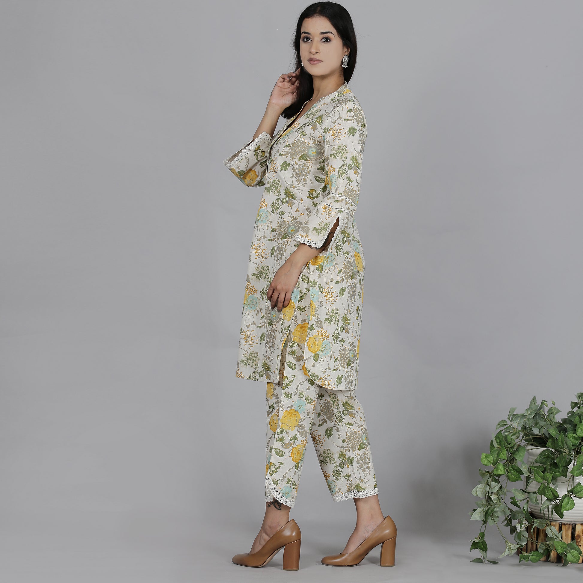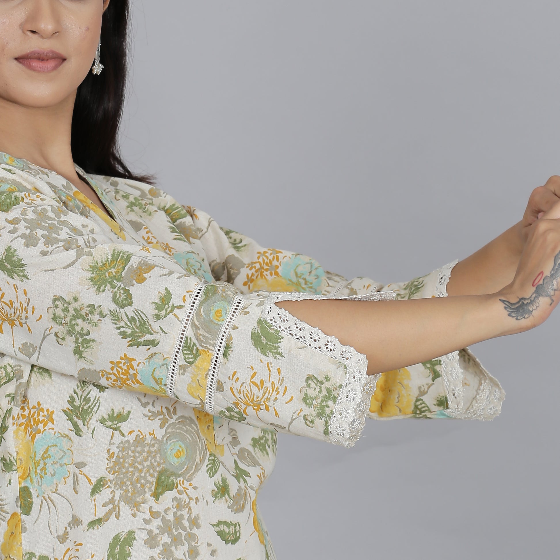 Introducing our yellow floral printed cotton flax co-ord set. It features a band collar with hooks on the placket and open slit sleeves with lace detailing. Designed for comfort and style, this set is perfect for a day out.