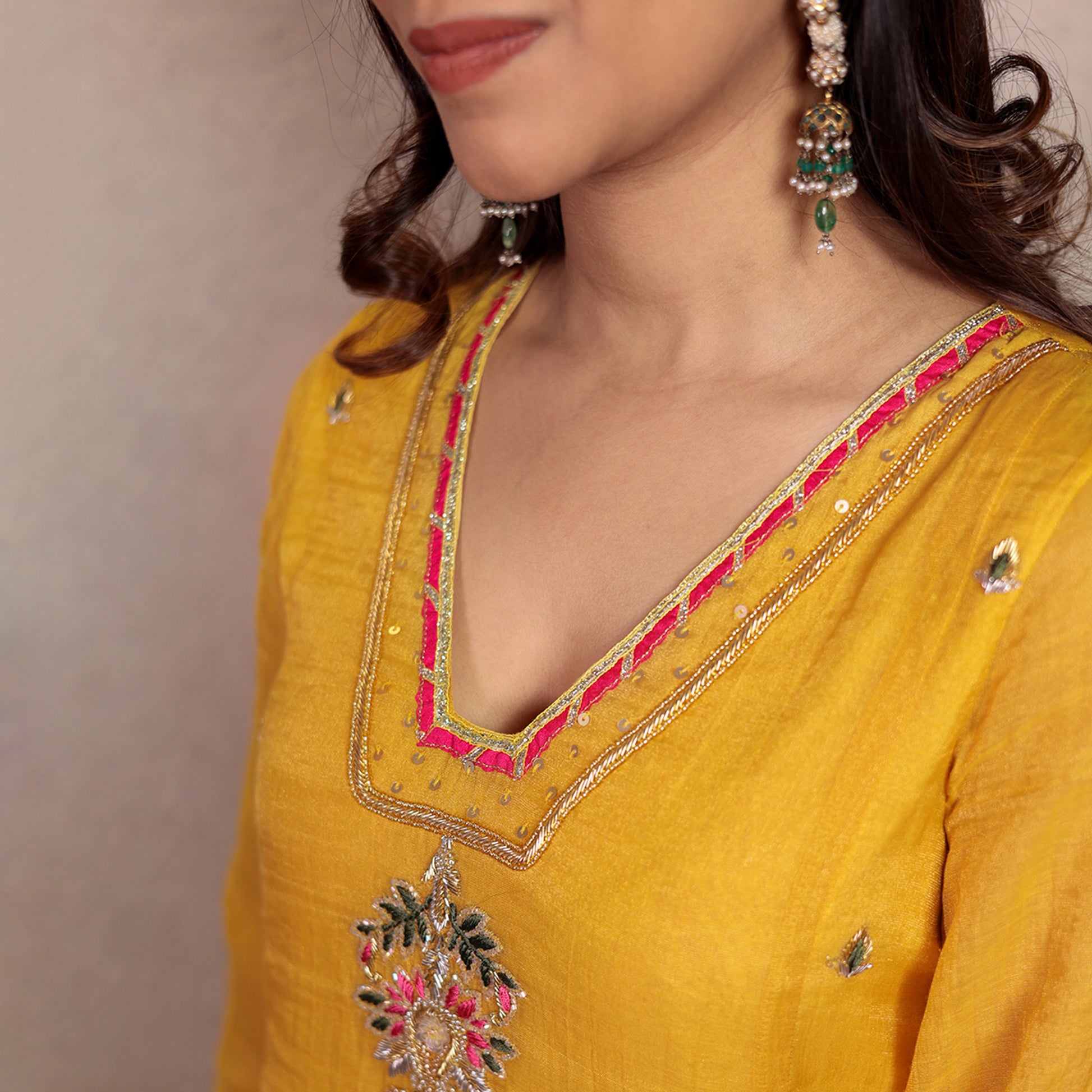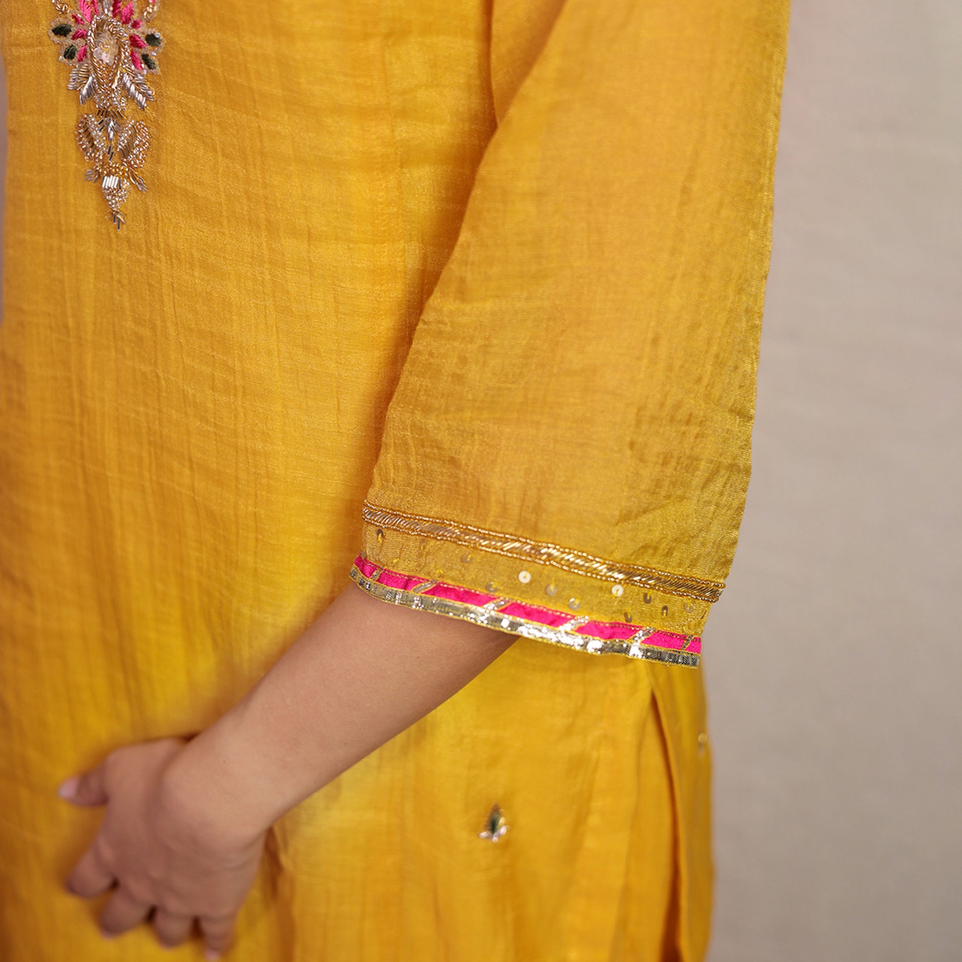 This Yellow Chanderi Hand-Embroidered Kurta Set beautifully combines tradition with style. The kurta and bottom showcase intricate hand embroidery, enhanced by gota and sequin detailing on the neckline and sleeves. It is perfect for any special occasion.
